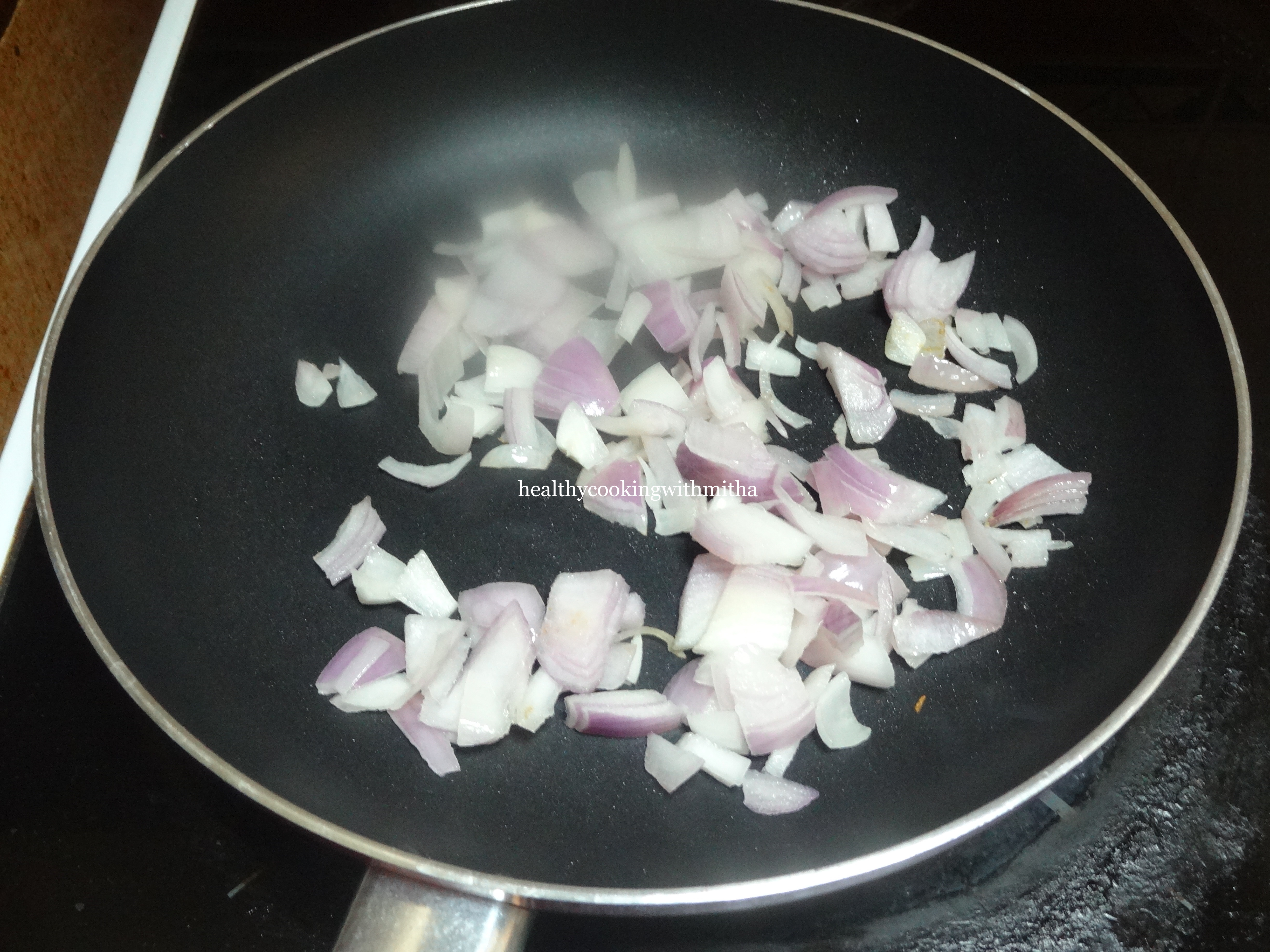 1. Heat 1 tsp oil in a pan and add roughly chopped onion to it. Fry well till it changes colour to translucent.