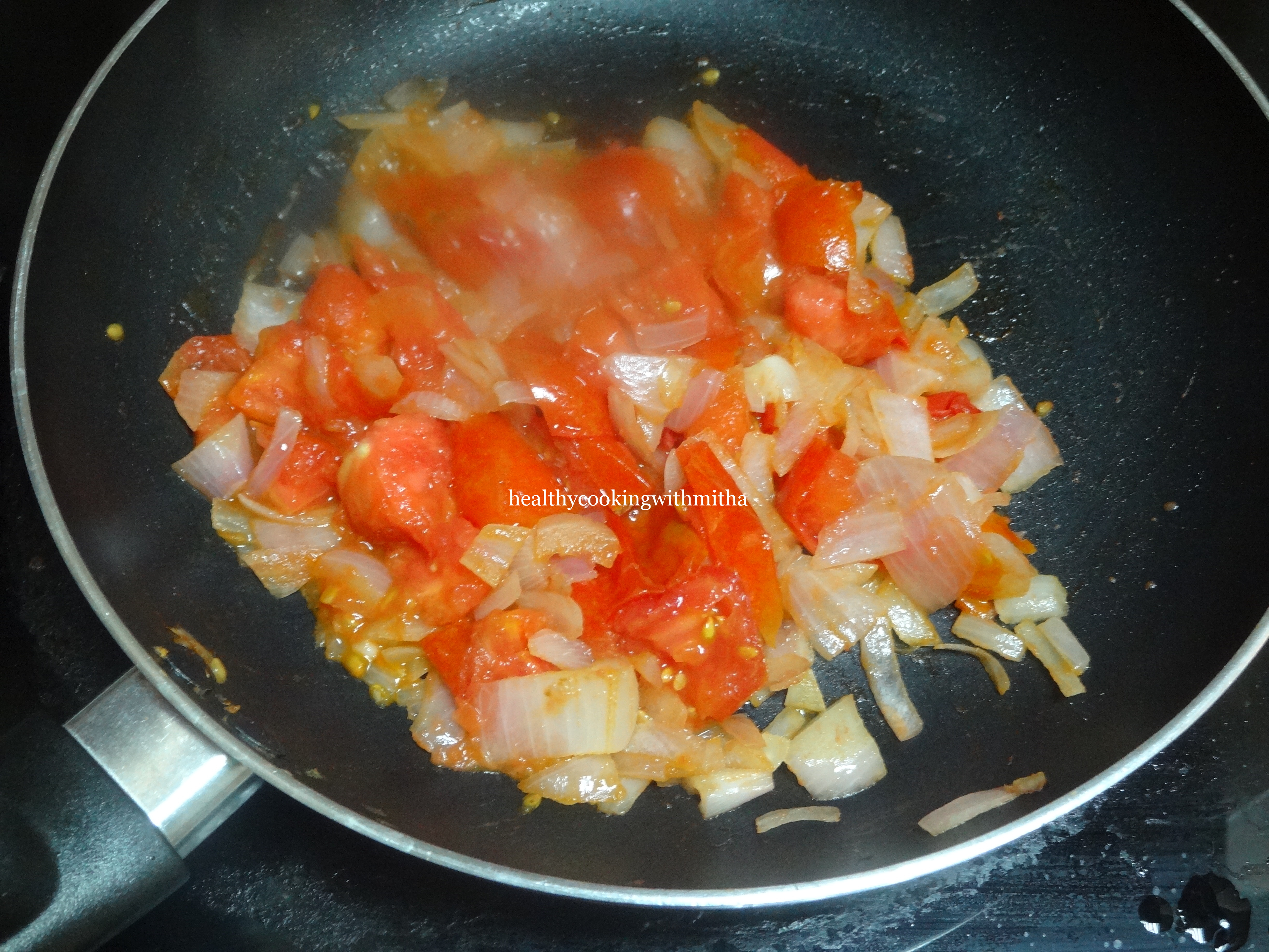 2. Now add roughly chopped tomatoes. Fry well and cook till the tomatoes turn mushy. Allow it to cool by removing from flame.
