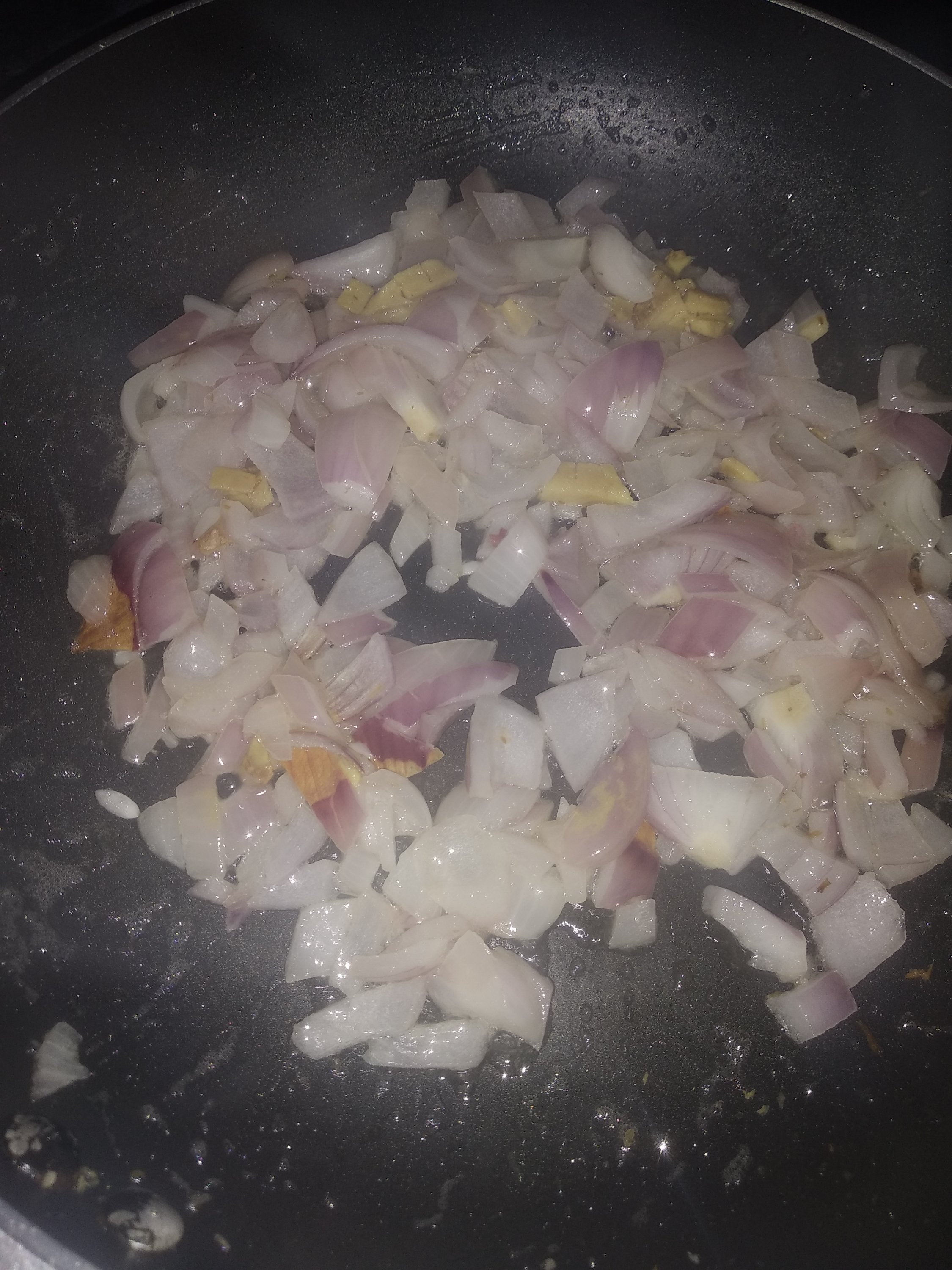 3. Heat oil in the same pan again and add ginger and onions. Fry till the onions turn translucent.