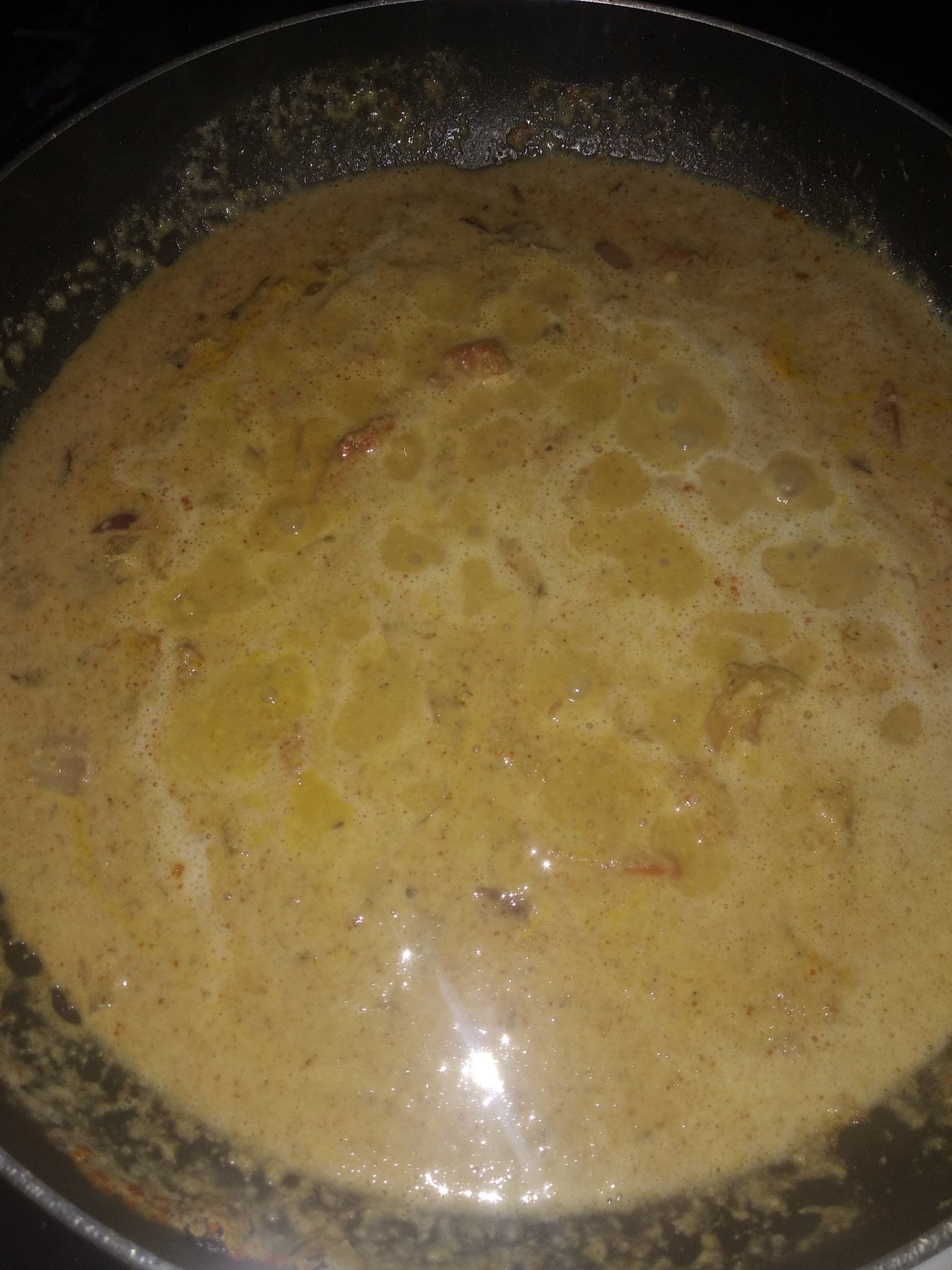 5. Add the spice paste along with turmeric powder, red chilli powder and coriander powder. Cook for about 5 mins till the gravy thickens.