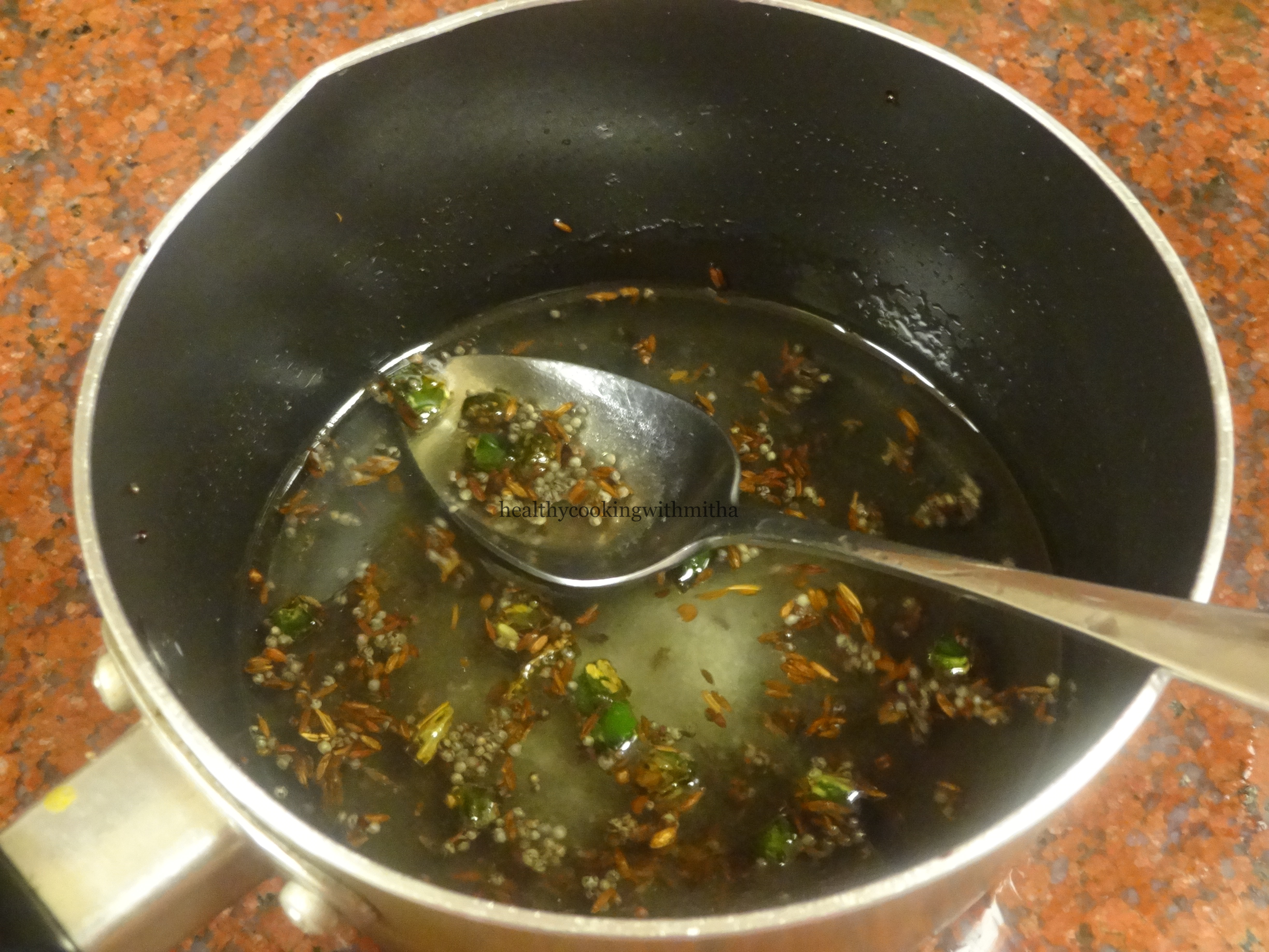 * Heat oil in a pan and splutter mustard seeds, cumin seeds. Add green chillies and fry for few seconds.