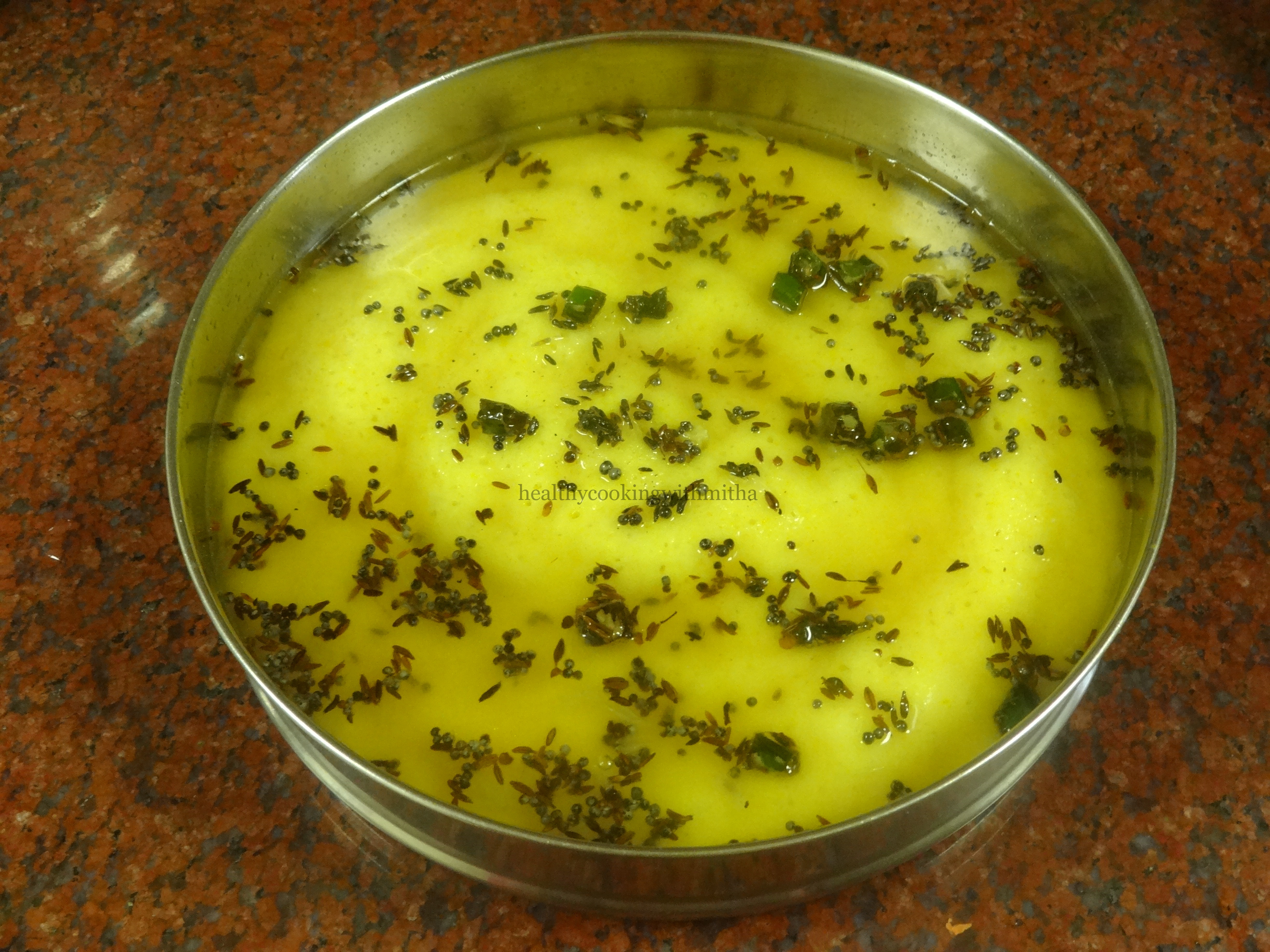 6. Pour over the steamed dhokla. Let it rest for atleast 30 mins so that the seasoning is absorbed well by the dhokla sponge.