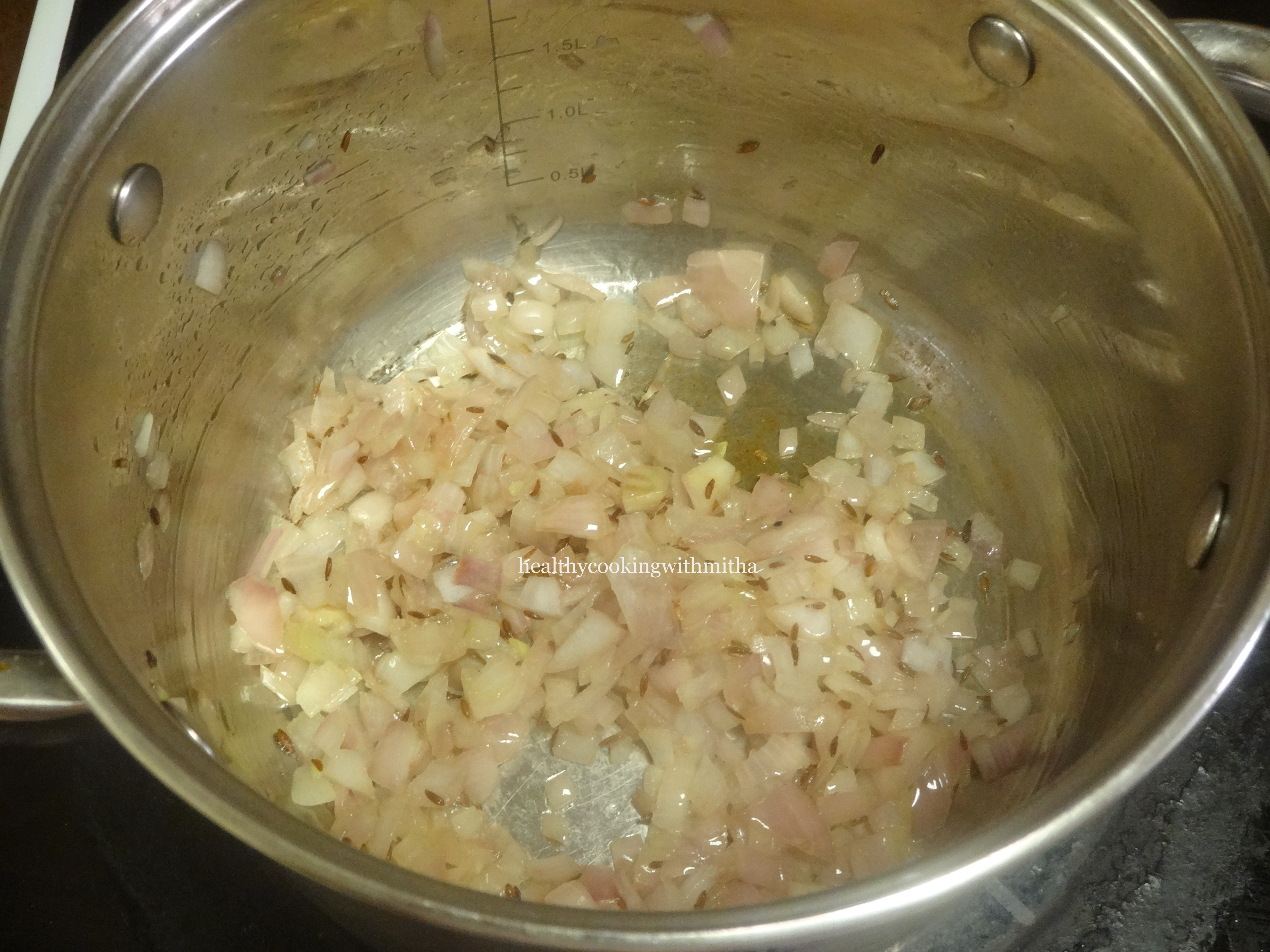 2. Heat oil in a pan and add Jeera. Add chopped onions and fry till it turns translucent.