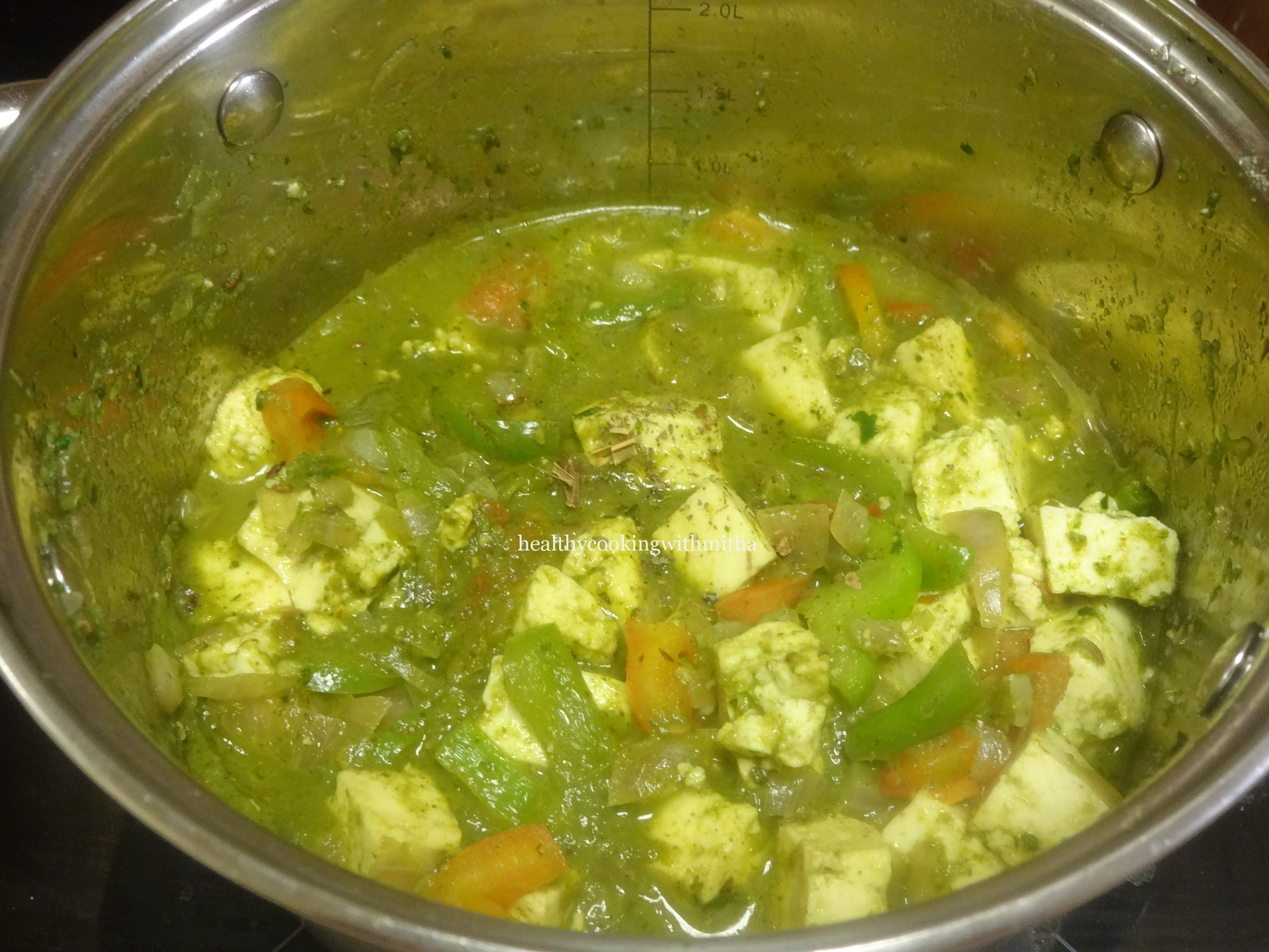 5. Add paneer cubes. Mix well. Cover and cook for 10 mins on medium flame.