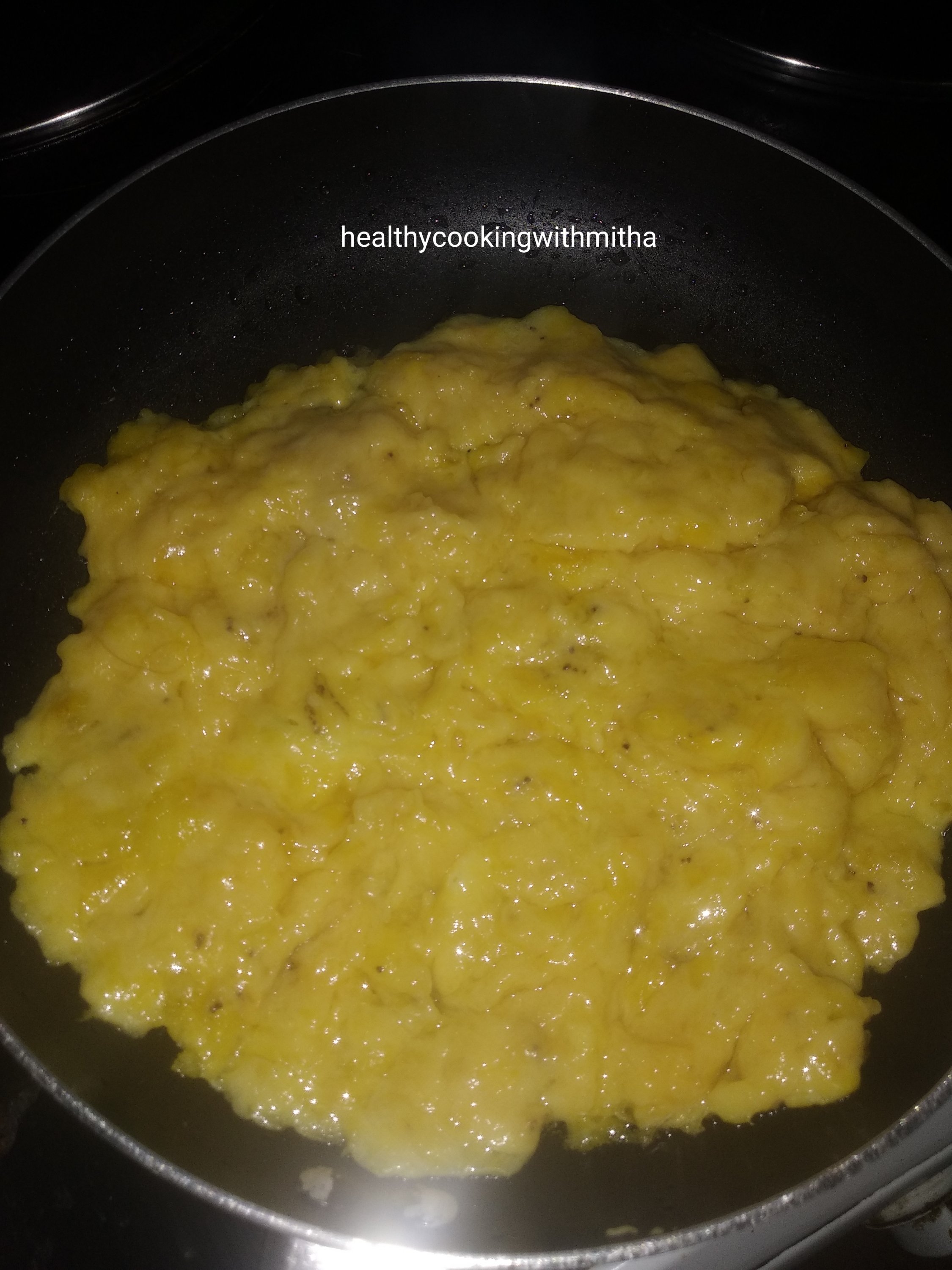 2. Heat ghee in a pan (preferably non stick) and add the mashed bananas. Fry well on medium flame till the rawness of the bananas goes away. Takes about 5 mins.