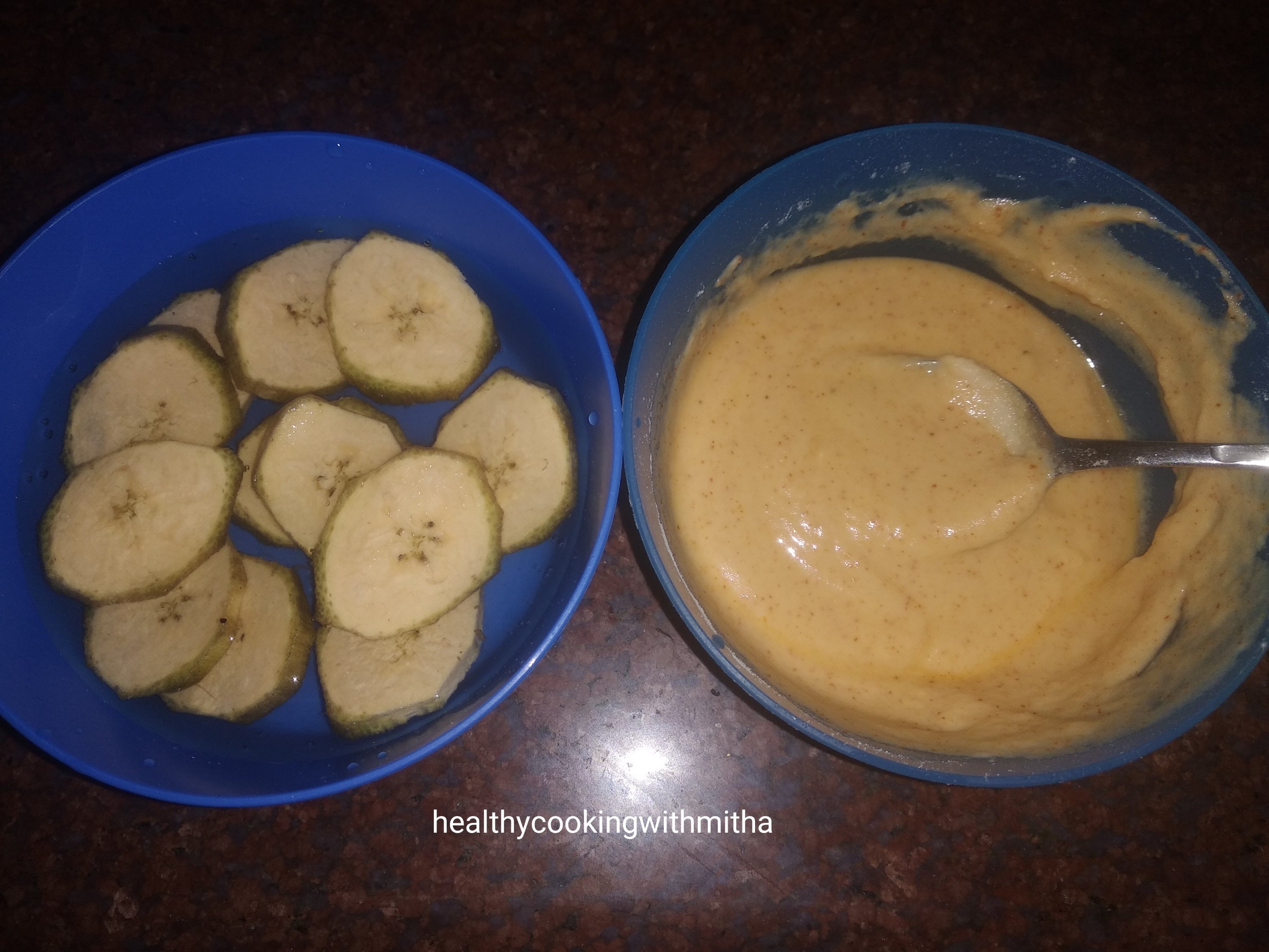 Note: Don’t make it thin as it won’t coat the raw bananas. Add only a Tbsp of water at a time.