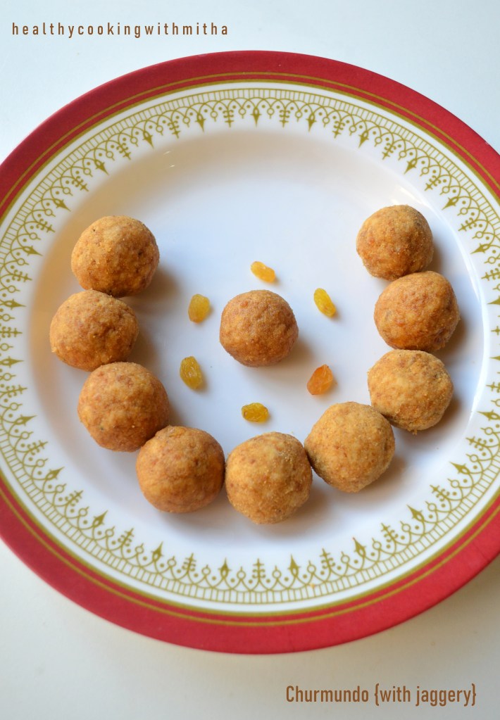 So I thought why not share this easy recipe of Churmundos. I make with jaggery as my family prefers jaggery sweets to sugary ones. Even though I am not very creative, I decorated them like a lamp as Diwali is less than a week away and I am all set for the festival. How do they look? π¬π