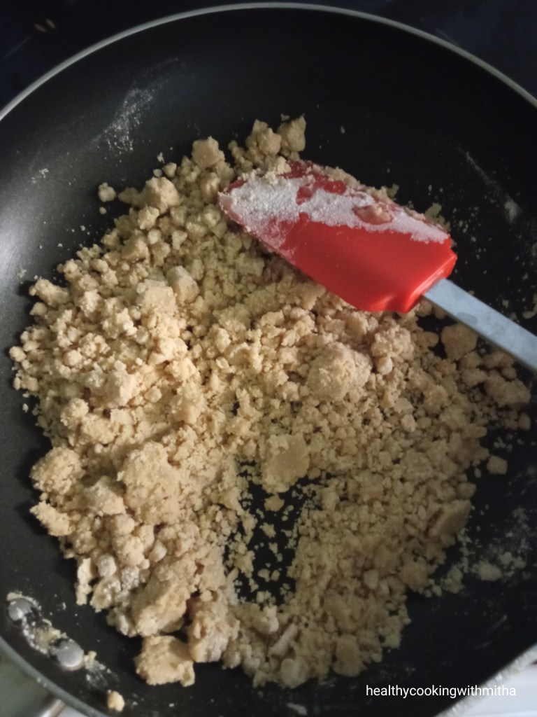2. In the same pan, melt ghee (don’t make it very hot. Just melt it on low flame.) Add wheat flour and start sauteing on low flame.
