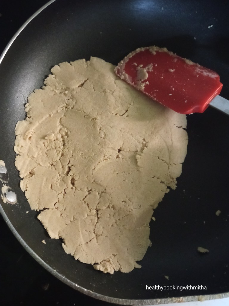3. Initially it will be in small lumps but as you continue sauteing on low flame while patting the lumps using the spatula (as shown in the below picture), it will be a smooth mixture. (This is after about 5 mins of sauteing)