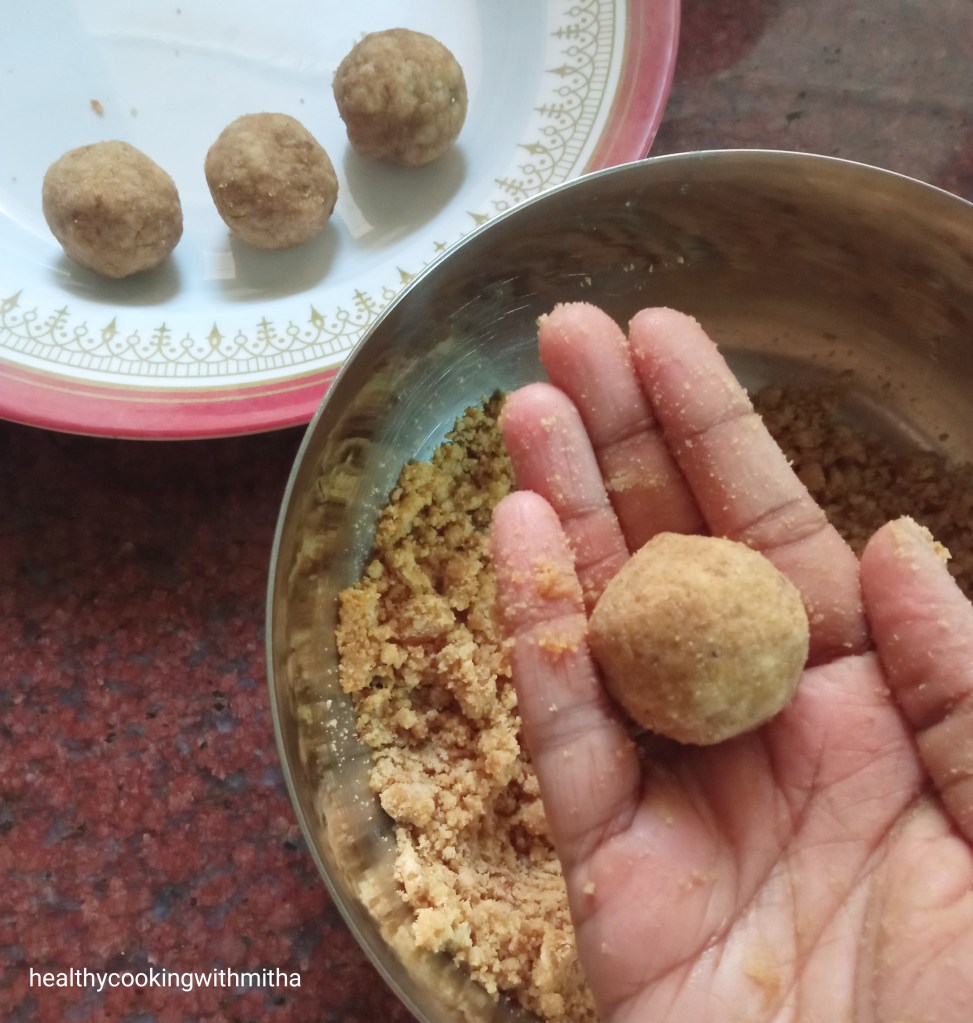 * While binding ladoos if you are unable to form them, add ghee if needed to the mixture and also your palms to get neat ladoos.