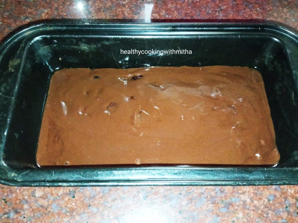 6. Mix well and add to a greased loaf pan. (Mine is of size 20 cm length and 4 cm width.) Grease the pan well with ghee. Level using spatula evenly.