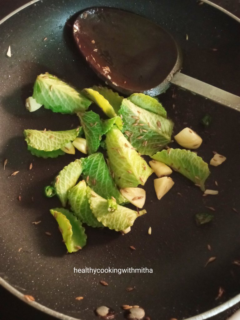 1. Heat oil in a pan and add cumin seeds. Fry for few seconds. Add green chillies and garlic. Fry till garlic turns slightly brown in colour. Add sambarpalli leaves and fry till it wilts.