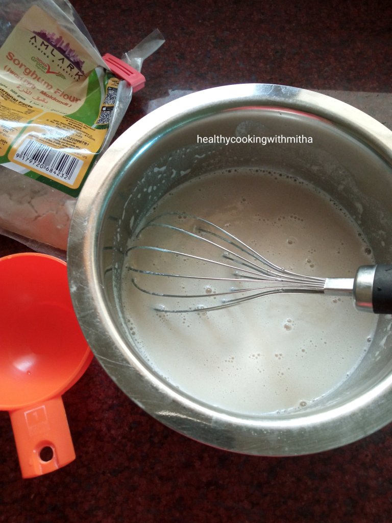* For me, 2 Cups Jowar flour and 3 1/4 Cups water yields perfect batter. Depending on your flour brand , it might vary a little for you.