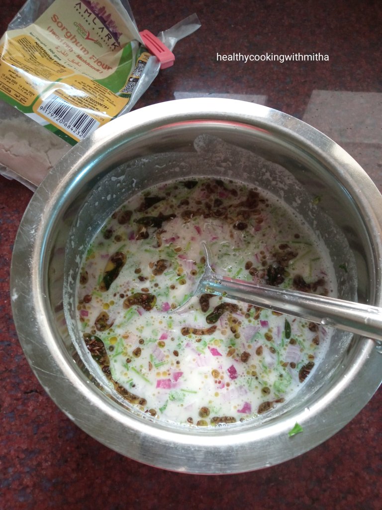 1. Take 2 Cups Jowar flour in a vessel and add 3 Cups water. Mix using a whisk to remove lumps and make a smooth batter. Add salt and mix well. (Adding one cup of water at a time helps in less lumps in the batter)