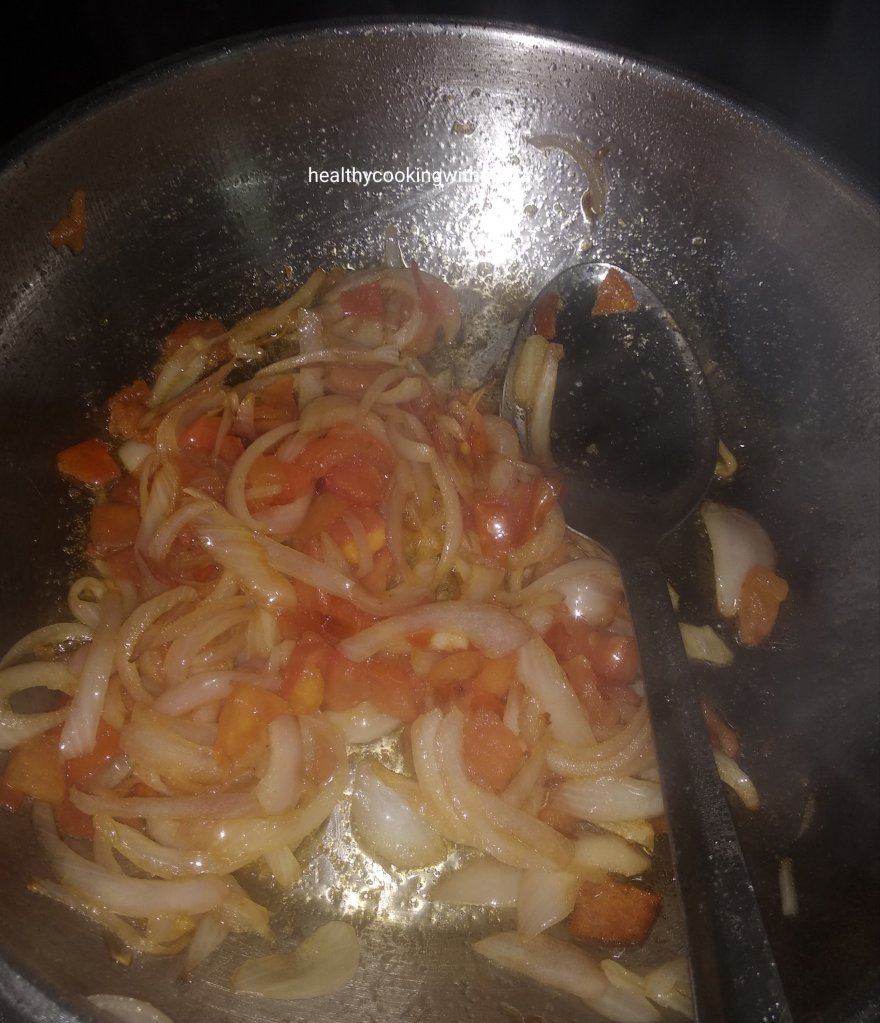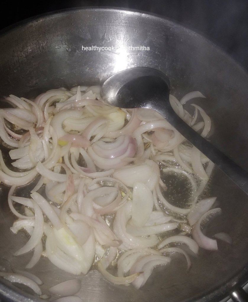 2. Now heat oil in a pan and add finely sliced onions. Fry till it turns translucent.