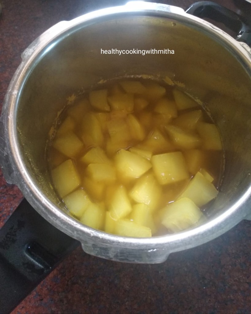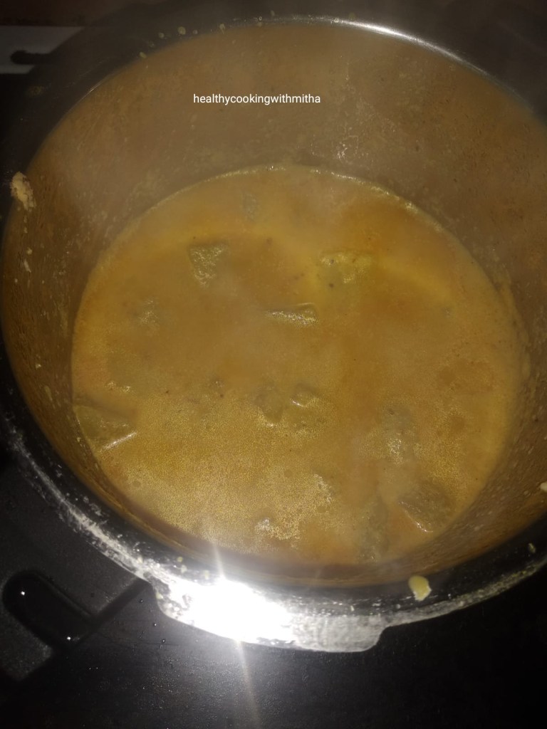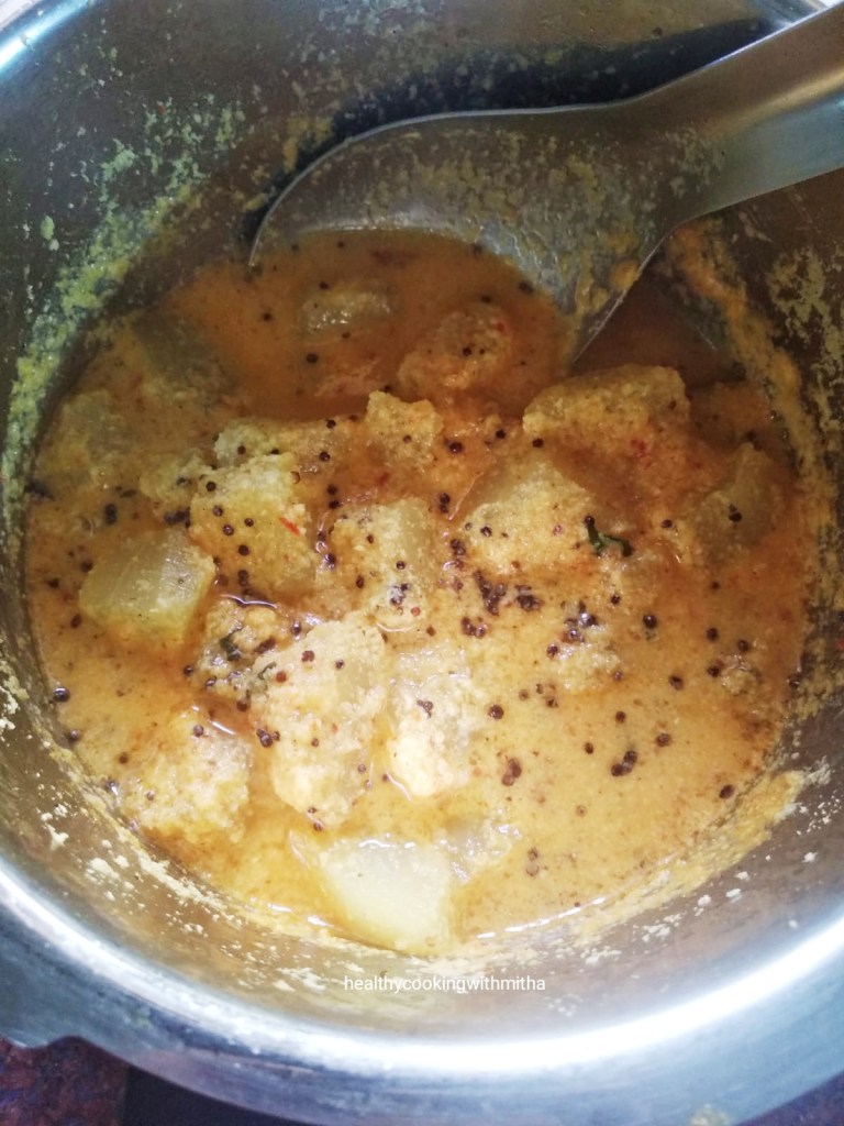4. Now add this paste along with salt, cooked moong to the raw bananas and cook together till the raw bananas turn soft. Also add water as needed. This a thick gravy.