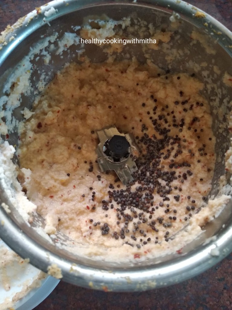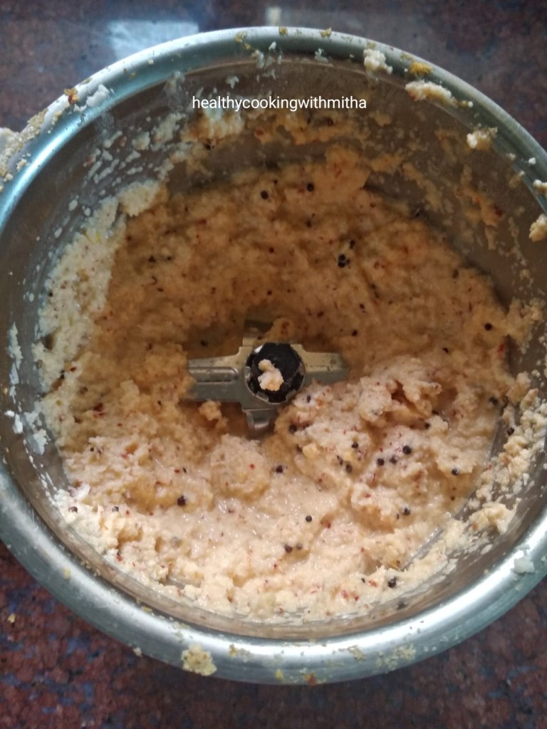 3. Now grind together coconut, fried red chillies and tamarind paste with little water to a smooth paste. Add this to the idli rava mixture.