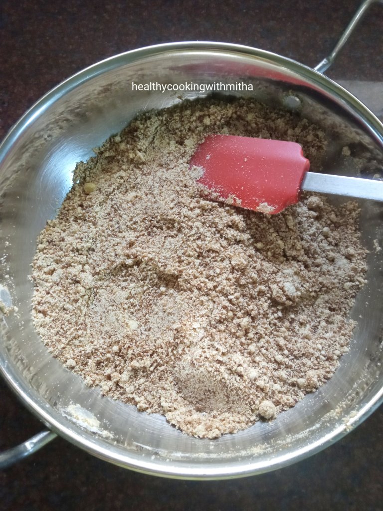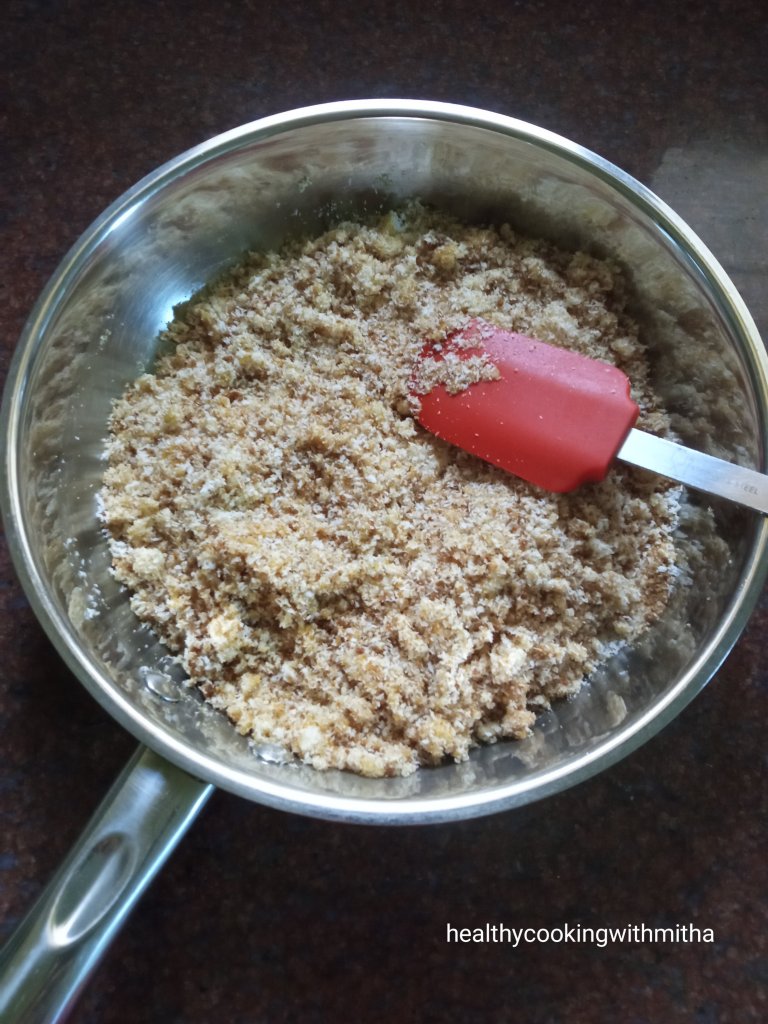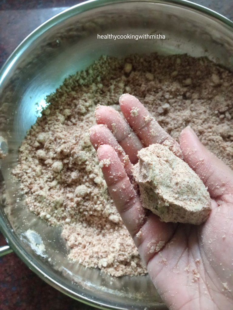 6. Now add ghee as required so that you can form ladoos from the mixture.. It took me 9 spoons of ghee.. You can add more too if needed..