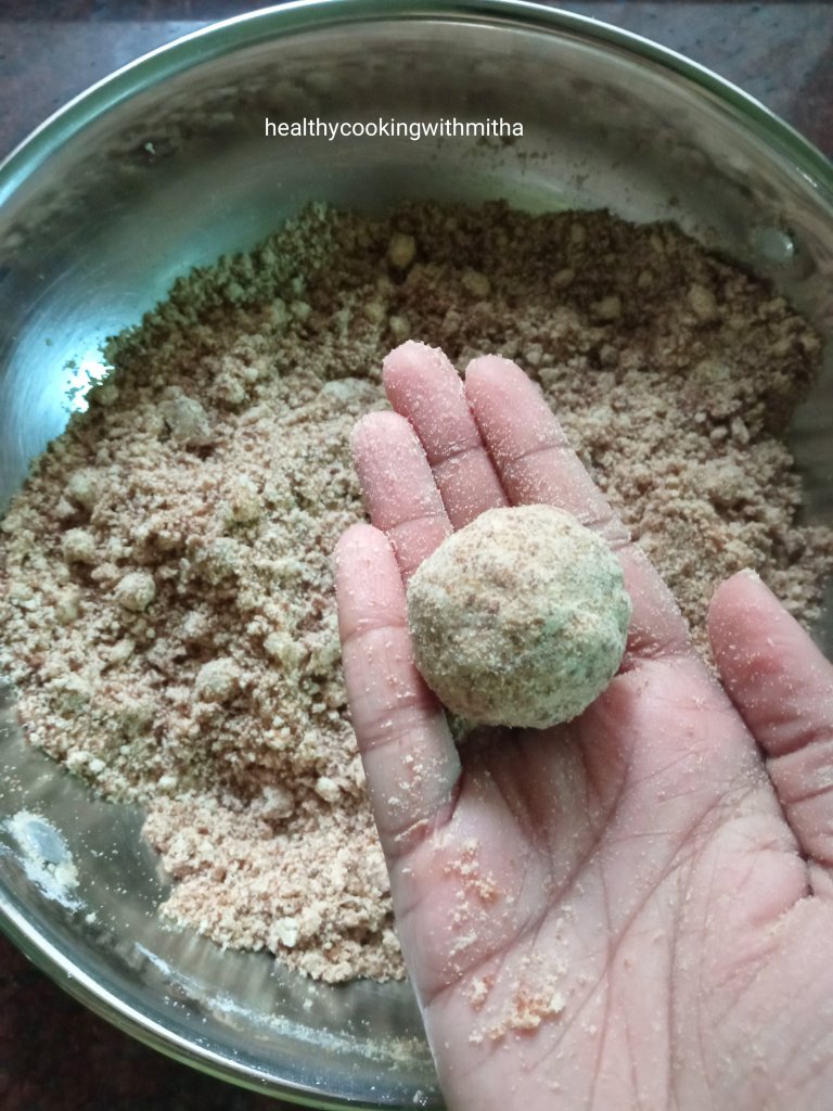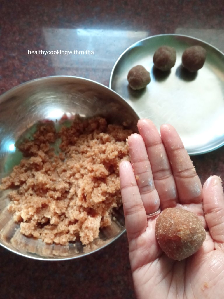 - These ladoos are rightly sweet and not over sweet. If you are a sweet lover, add around 2 spoons more of jaggery powder if you feel like. Taste the mixture and decide accordingly.