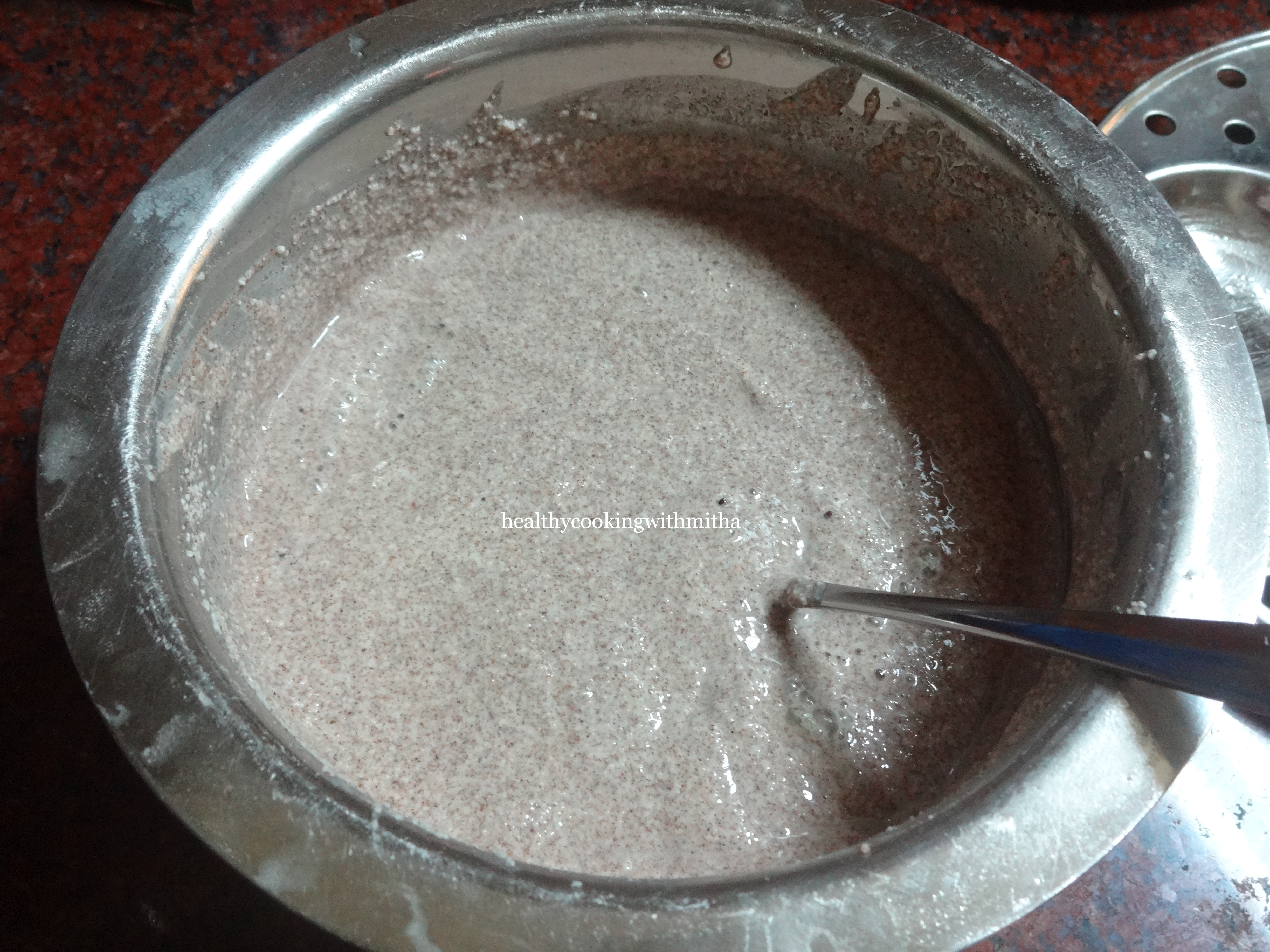 1. Take Sooji, ragi flour, curd and salt in a bowl. Add water little by little to make a thick batter whisking constantly to avoid lumps.