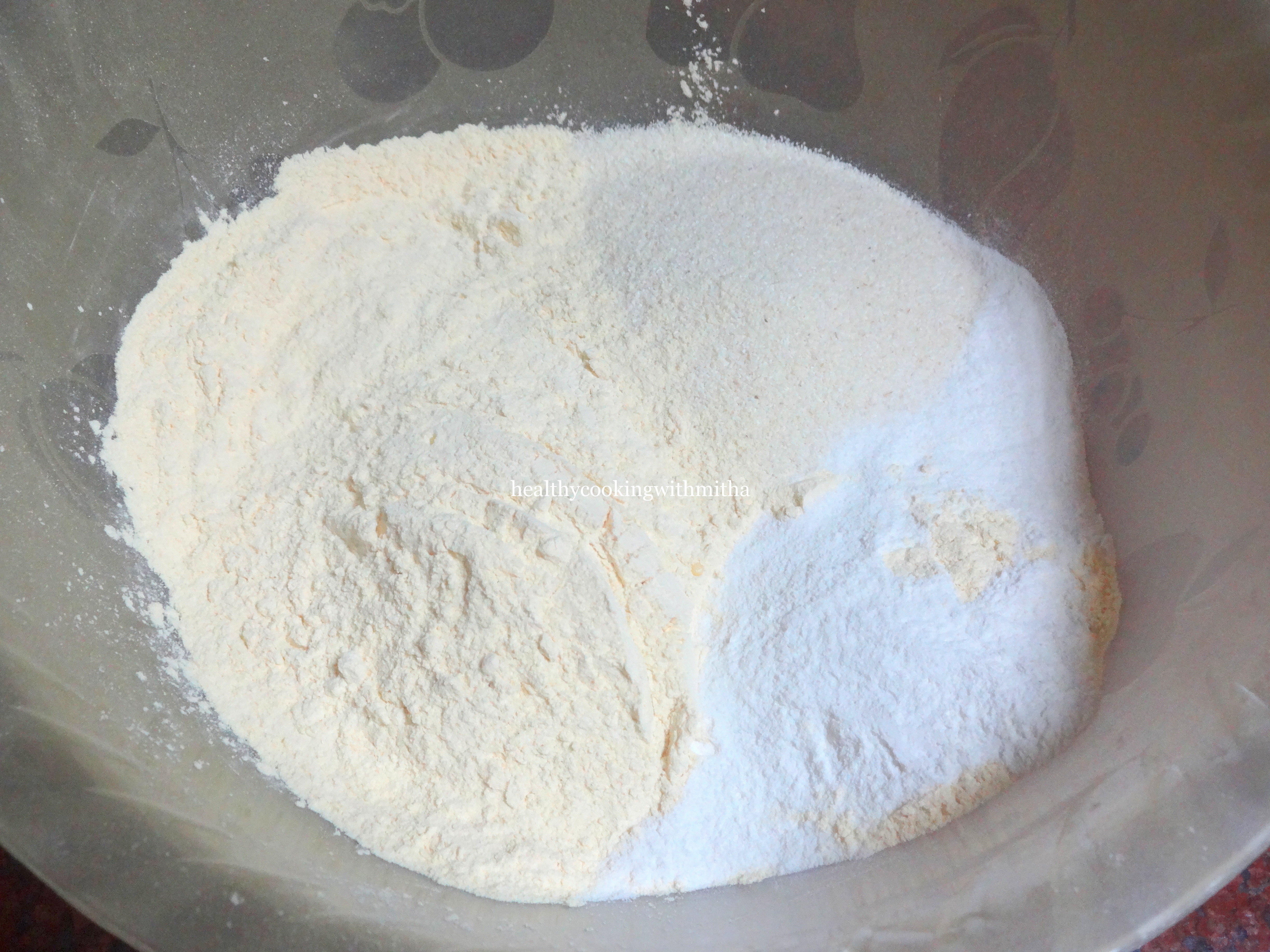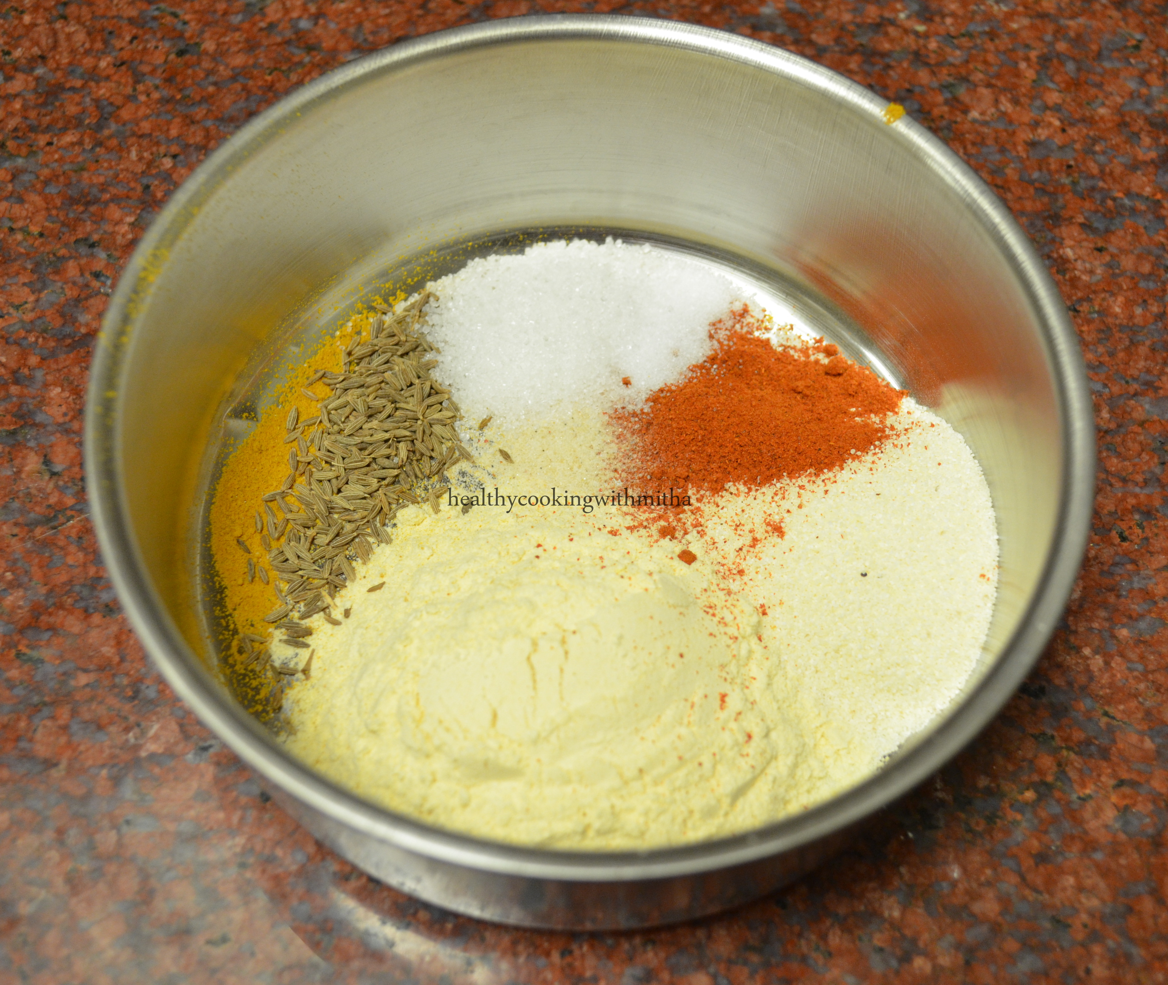 1. Take Besan, rava, turmeric powder, red chilli powder, cumin seeds, sugar and salt in a bowl.