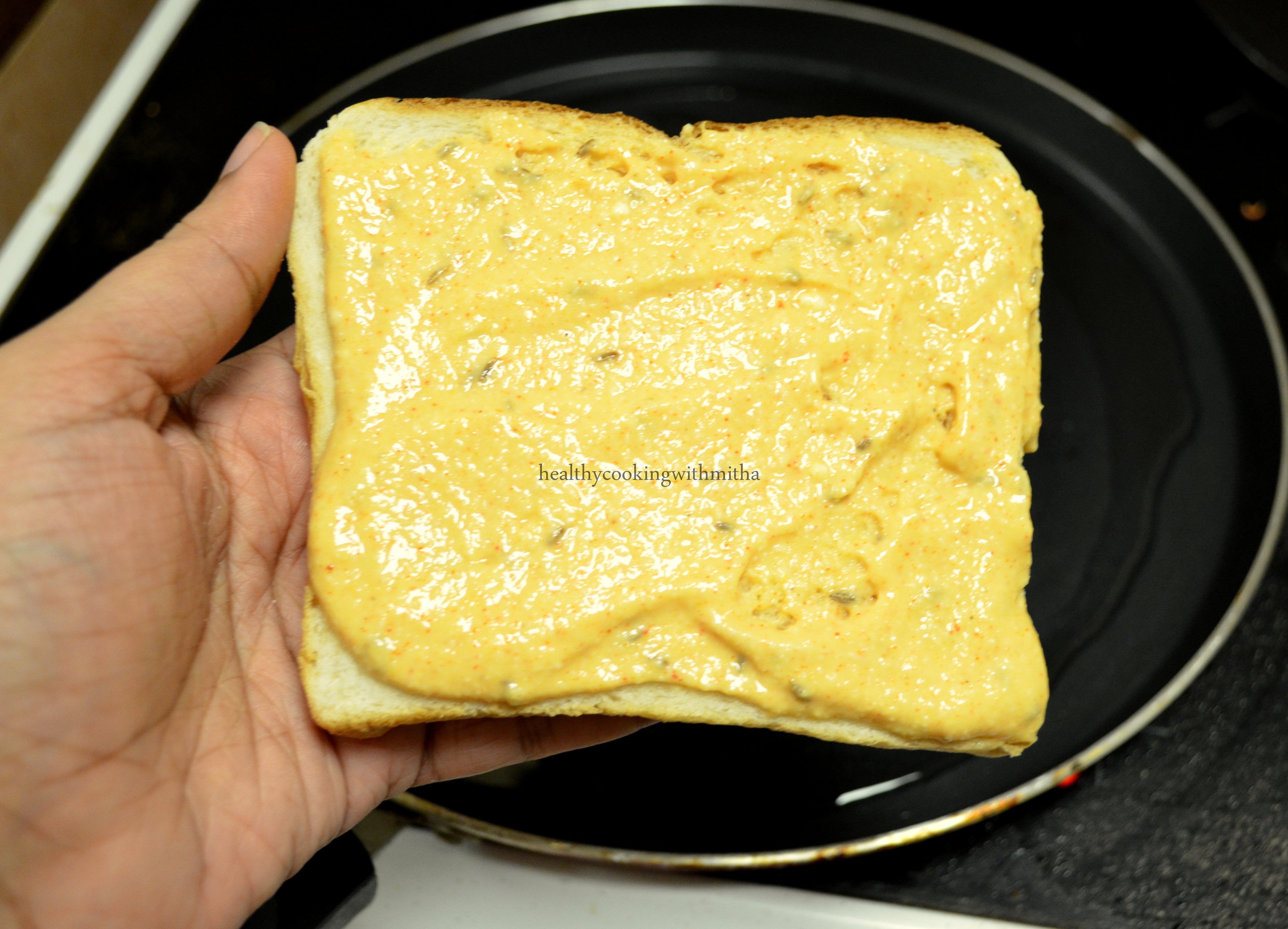 3. Heat little oil in a pan. Apply a spoon of this batter over bread and place it on the pan on the side where the batter is applied.