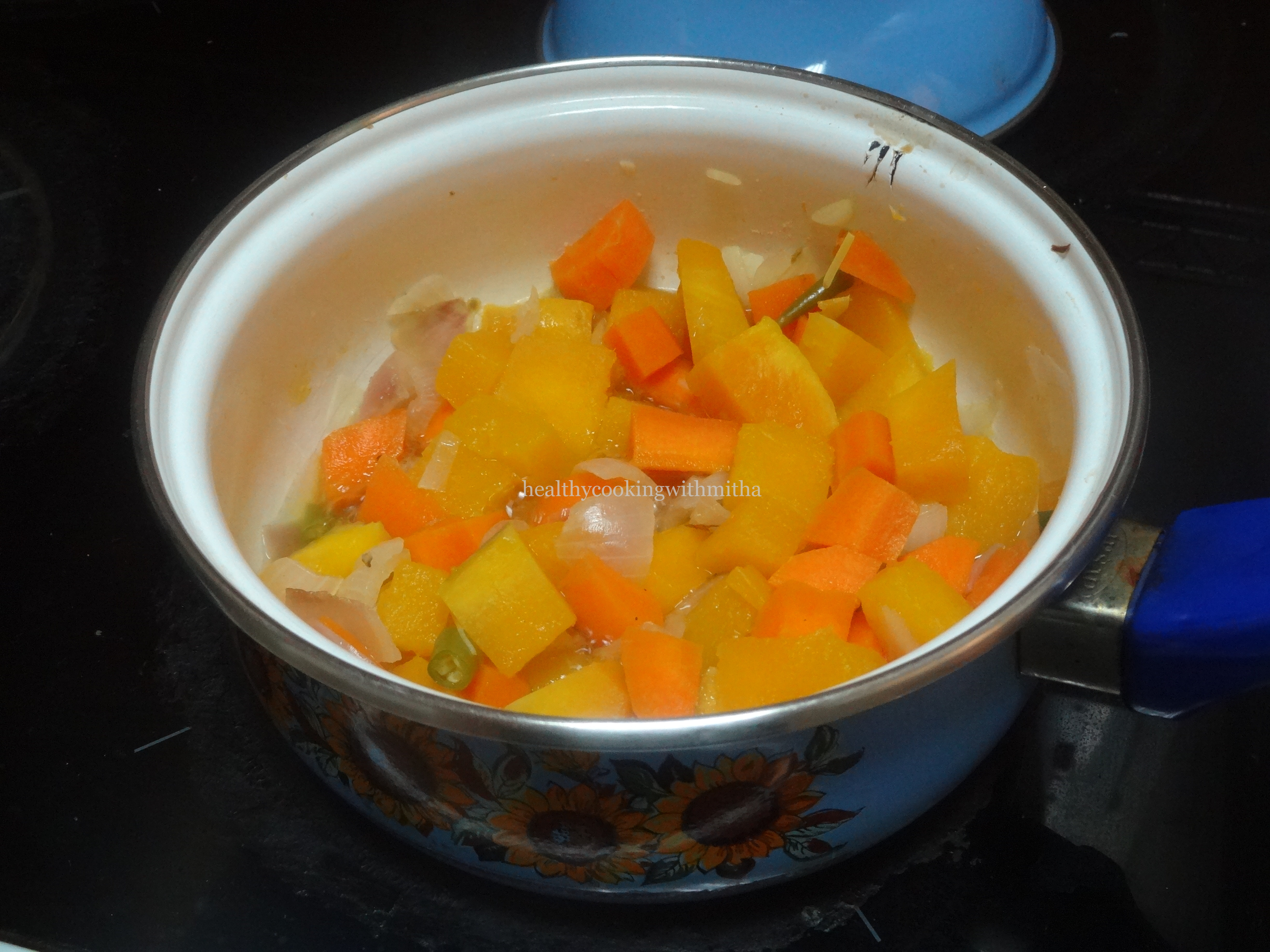 4. Pressure cook for about 3 whistles on high flame or cook till the carrots turns soft. Allow it to cool.