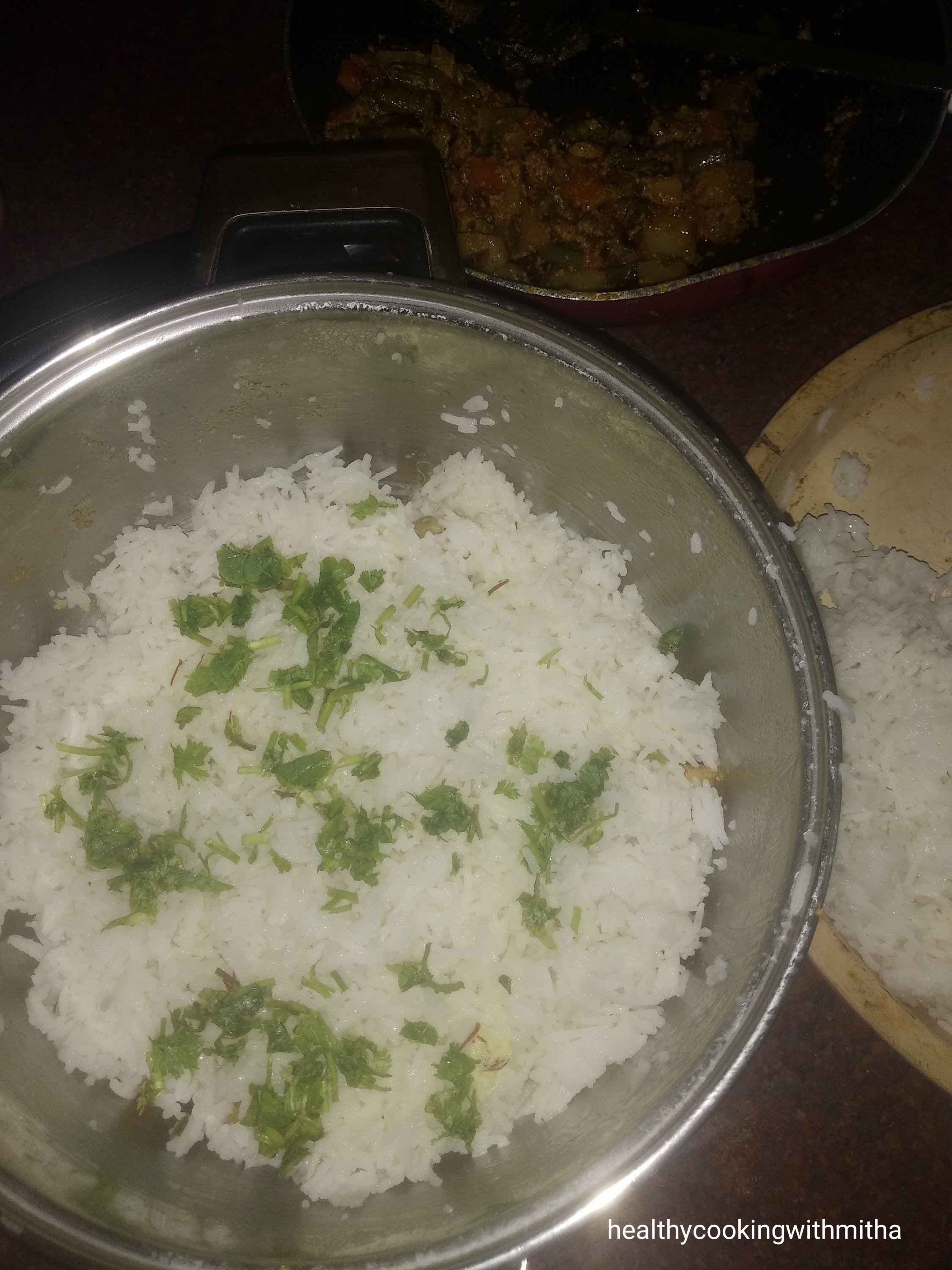 5. Now cover and cook on medium flame till the rice cooks well, turning soft yet the grains remain separate. You might need little more water depending on the quality of rice and the cooking range you use. Once cooked well, remove from flame and add chopped coriander leaves.