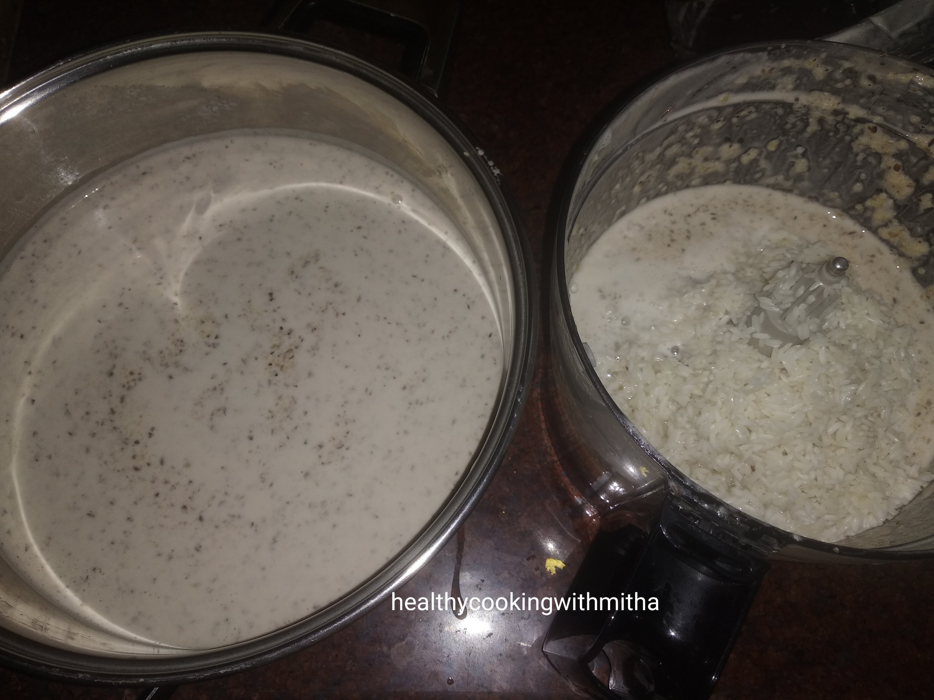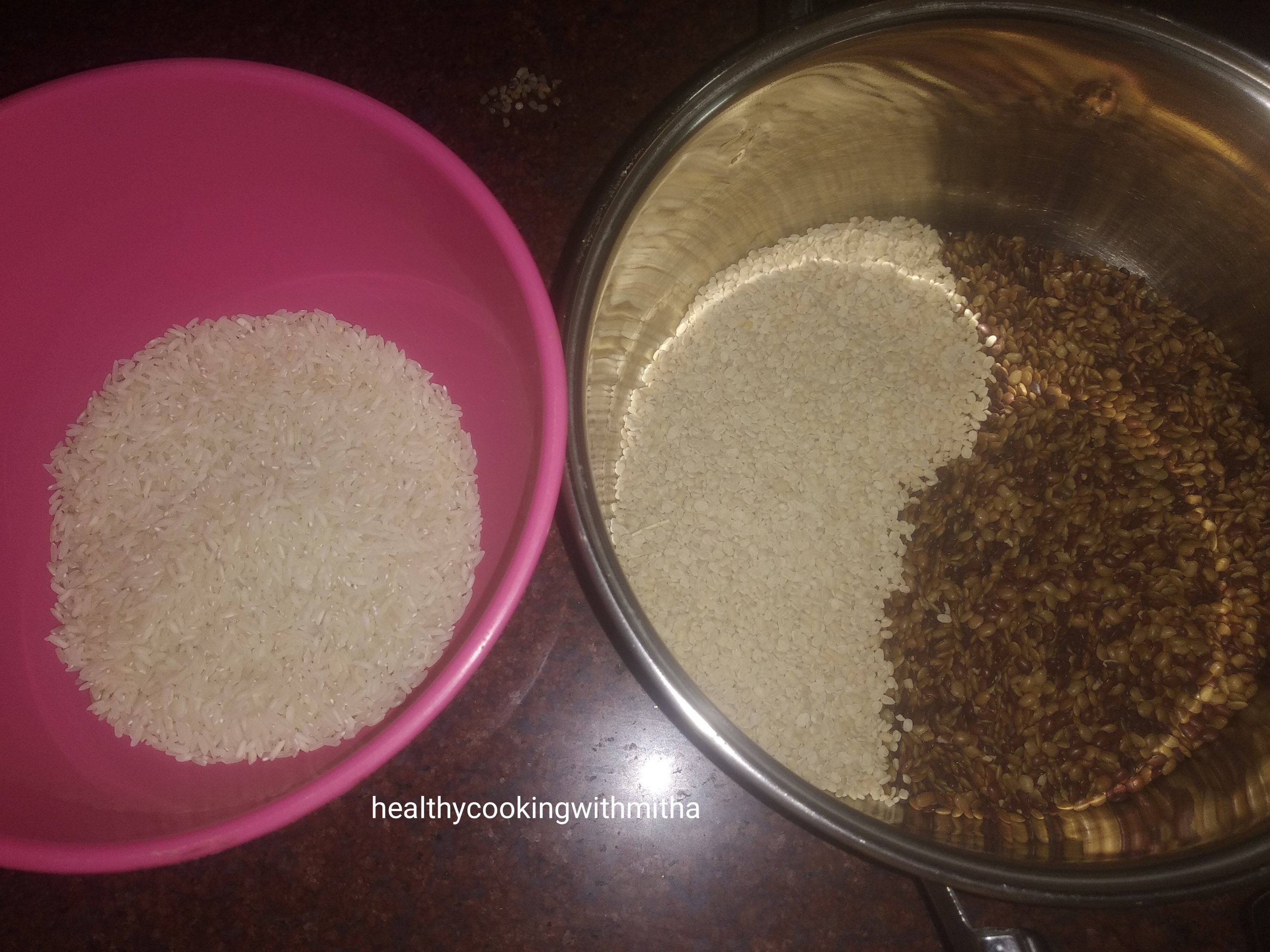1. Wash well and soak rice, Horsegram and Urad dal together for 4 to 5 hours. Now drain water completely. Add along with about a cup of water to a mixer.