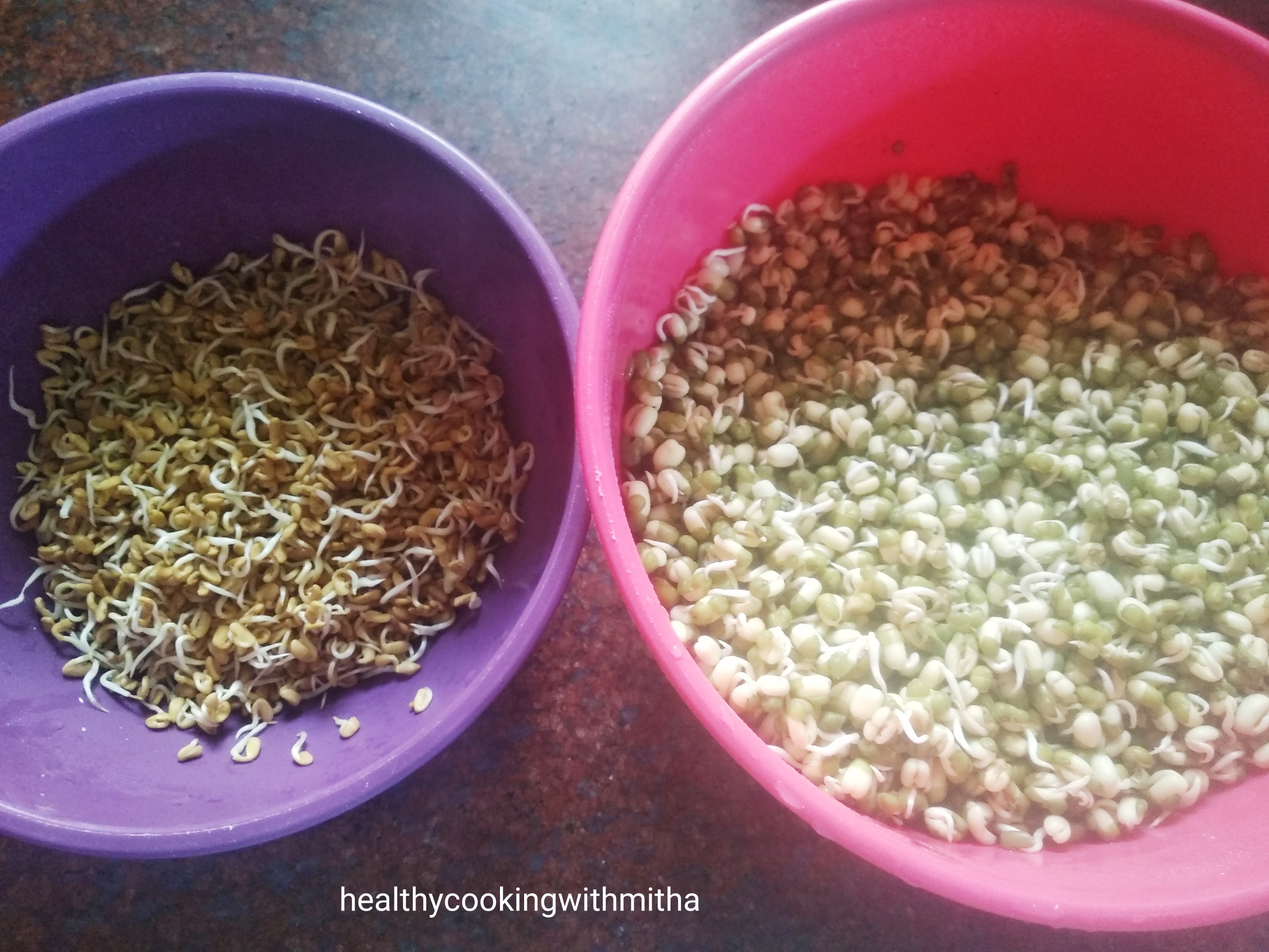 * Methi usually takes two days to sprout while moong sprouts within a day. But I sprout both for two days as it gives good sprouts for moong too.