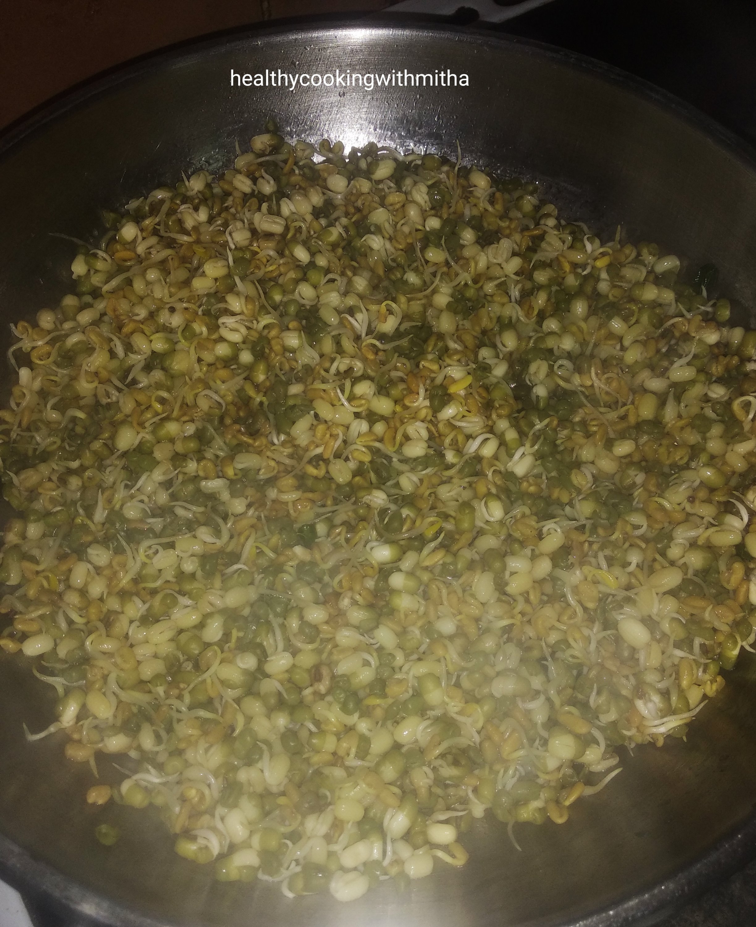 1. Pressure cook the sprouted moong with little salt and water enough to cover it for 2 whistles (depends on the cooking range) or till they turn soft.