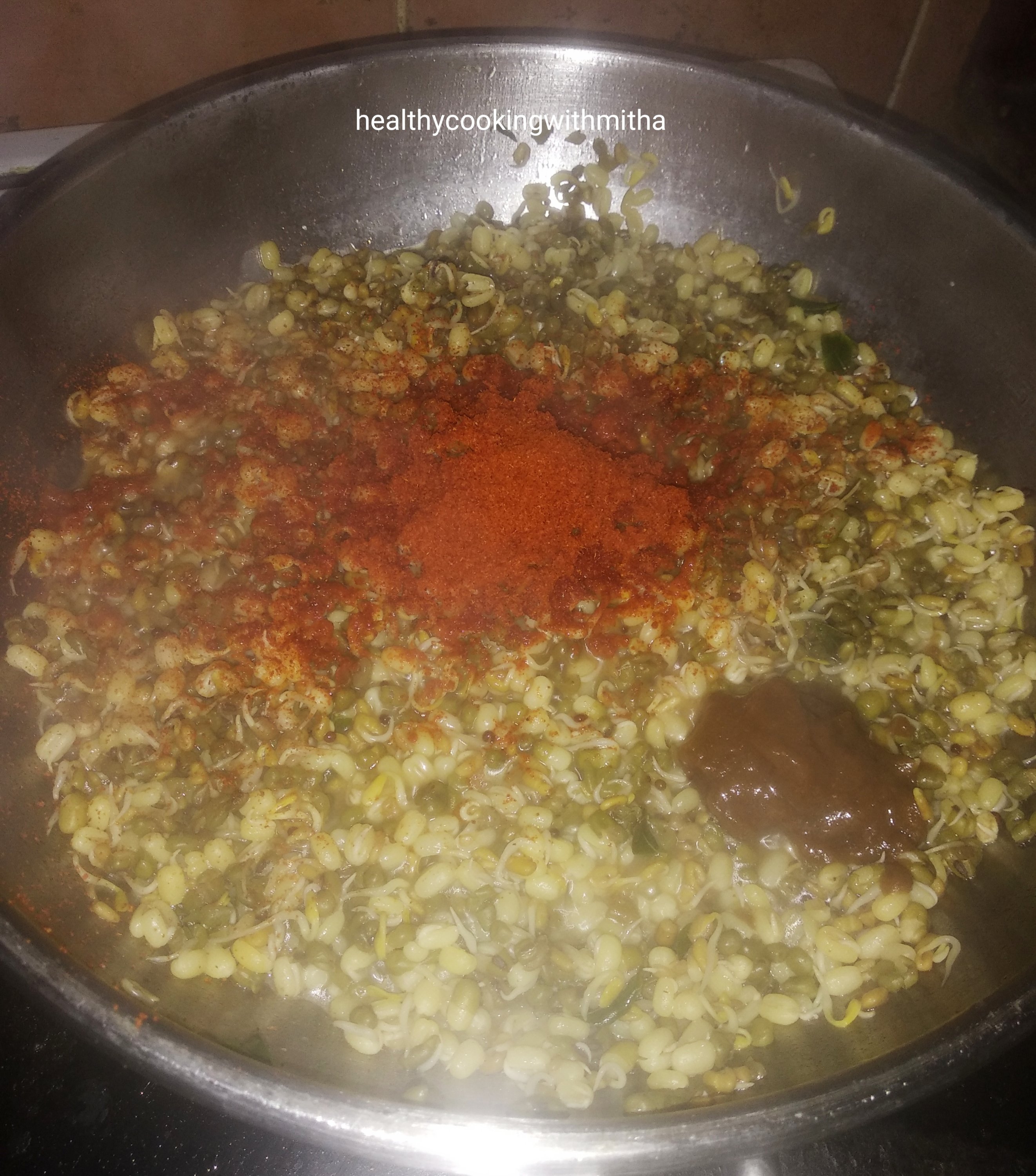 7. Add 3 cups of water and cook covered till the sprouts turn soft but still are firm. Add tamarind paste, salt and red chilli powder.