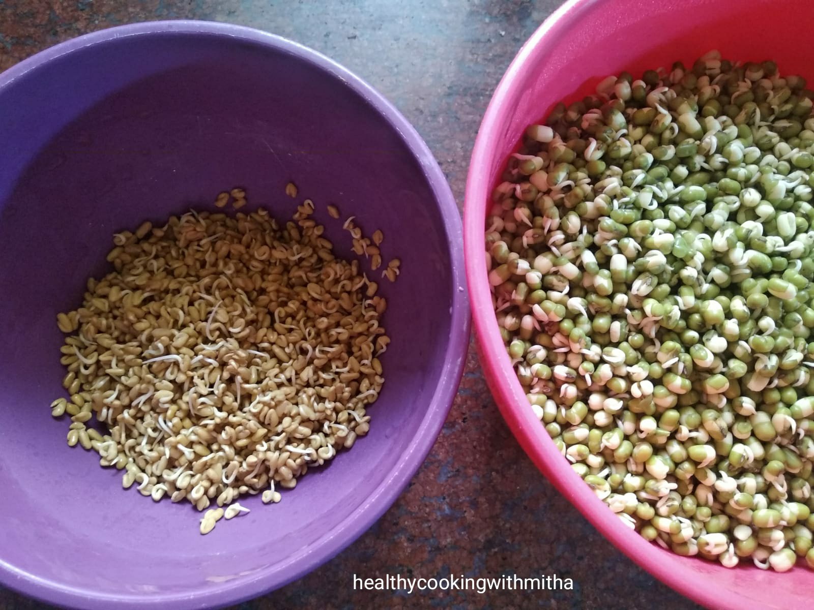 1. Wash well and soak Fenugreek seeds and whole moong separately in atleast thrice the amount of water overnight or for atleast 8 hours.