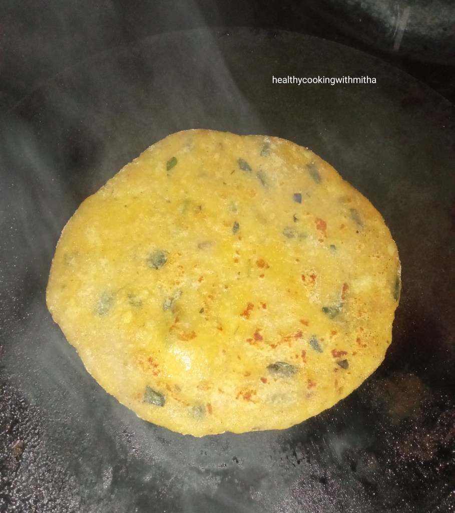 9. Now heat a pan/ tawa and place the paratha over it. Fry both sides using ghee till it browns and cooks well.