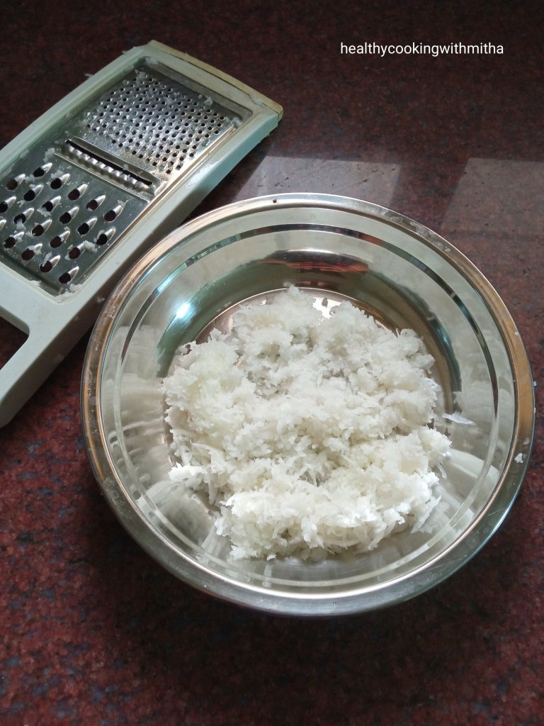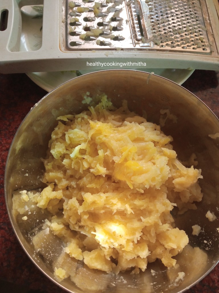 3. Now squeeze the radish gratings and add to another bowl. Don’t discard the water. We will knead dough in it.