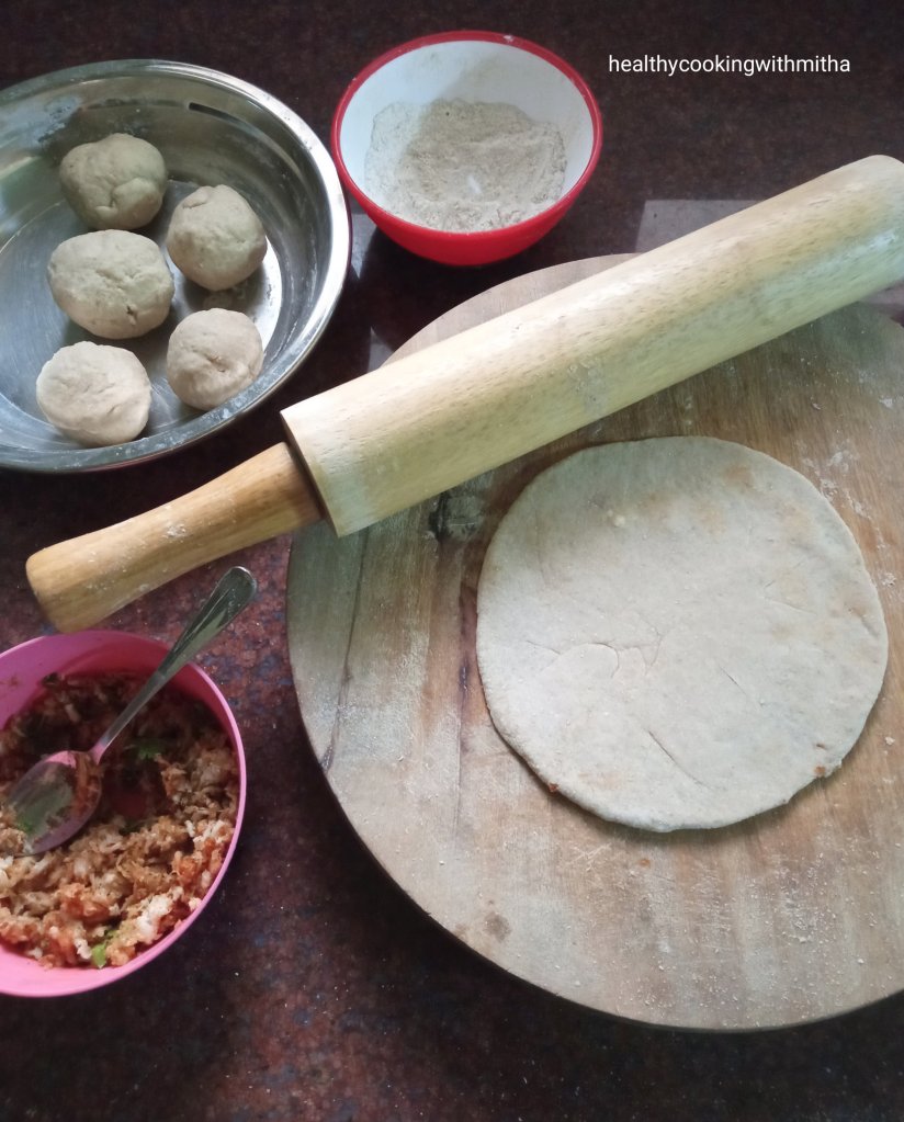 8. Dip again in dry wheat flour and roll as thin as possible, ensuring that you don’t give much pressure as the filling can come outside.