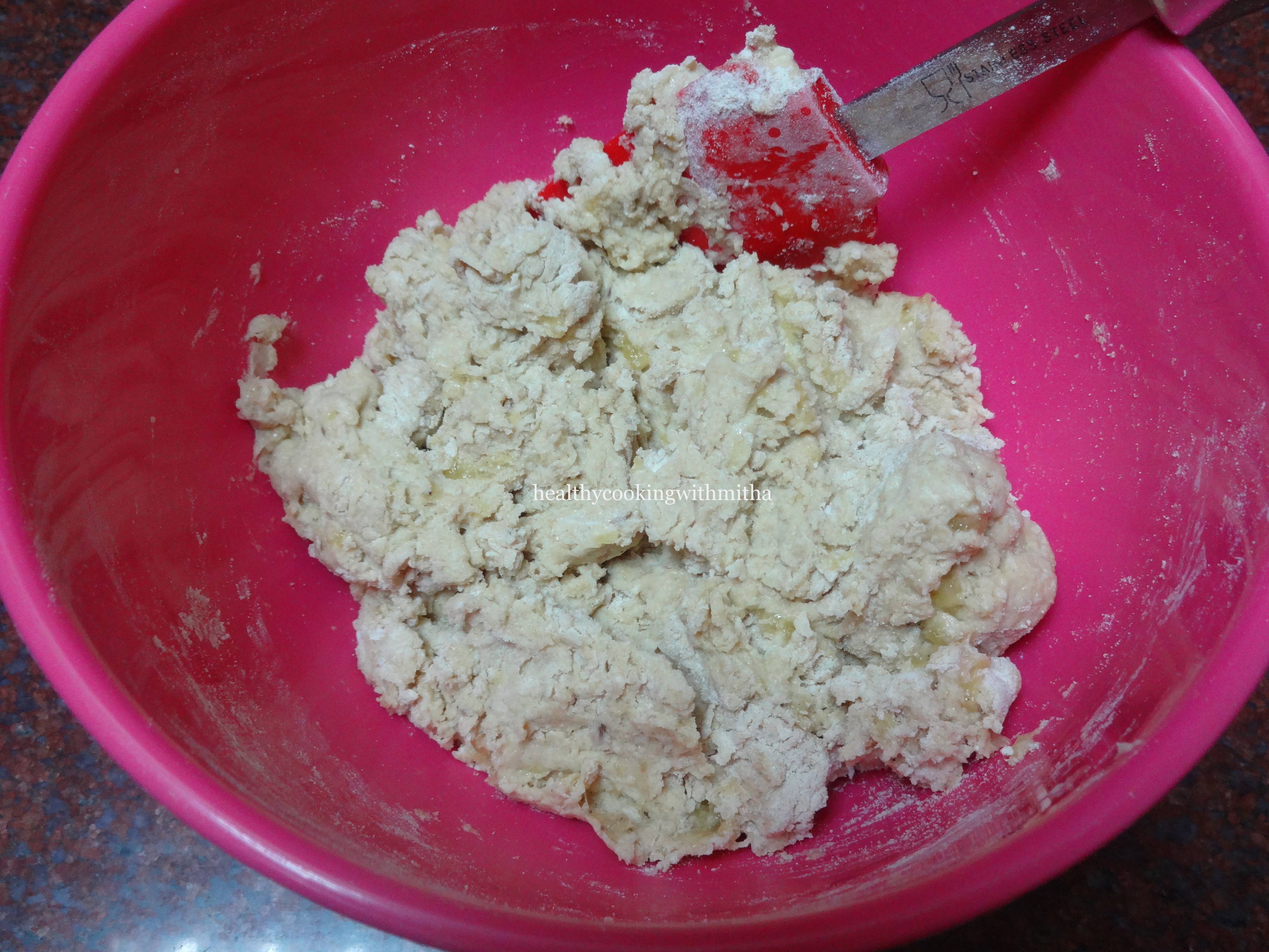 5. In the radish water, add wheat flour and knead a soft dough similar to chapati dough. Add extra water if needed to knead the dough. No need to add salt as we have already added to radish.