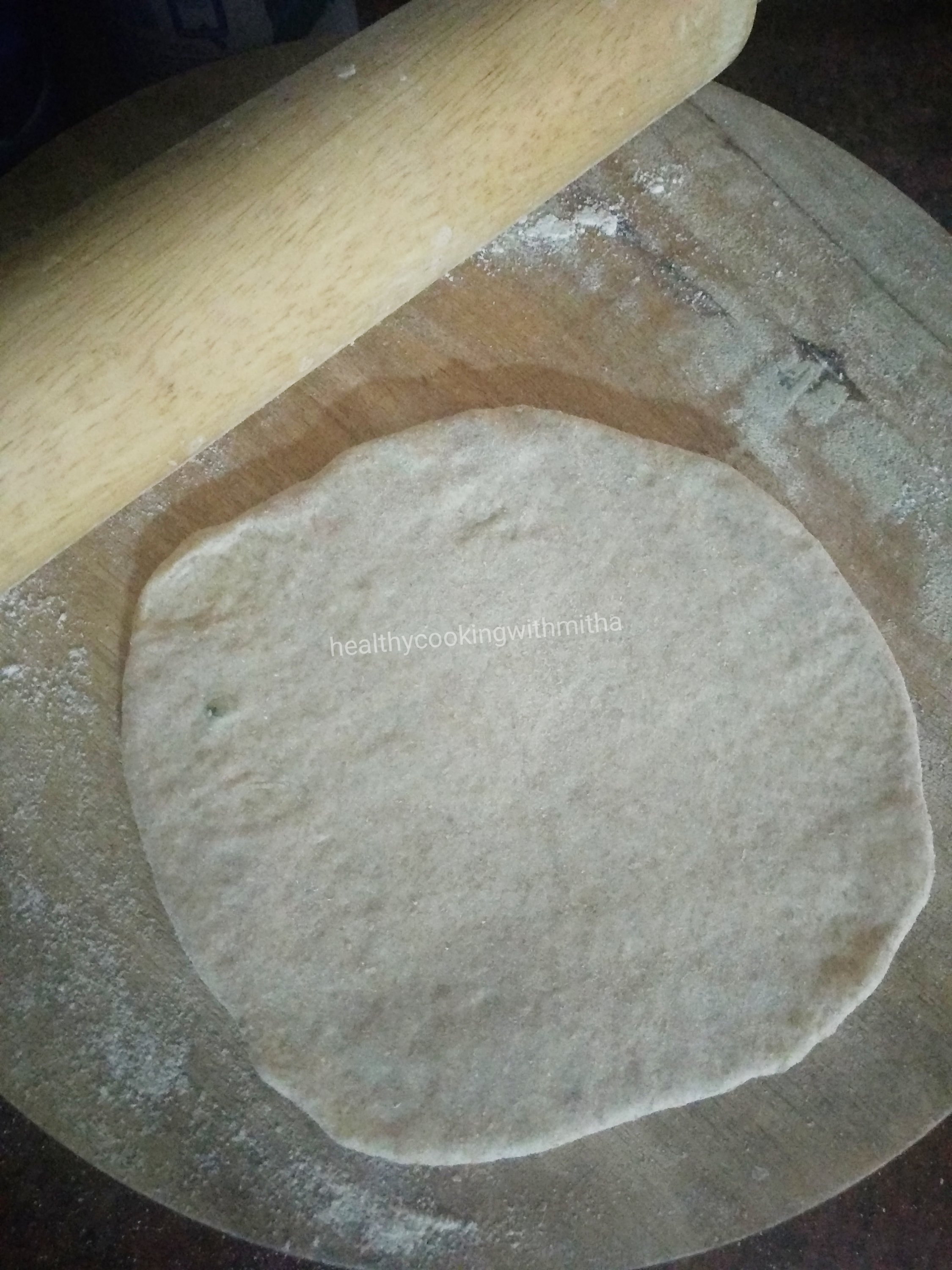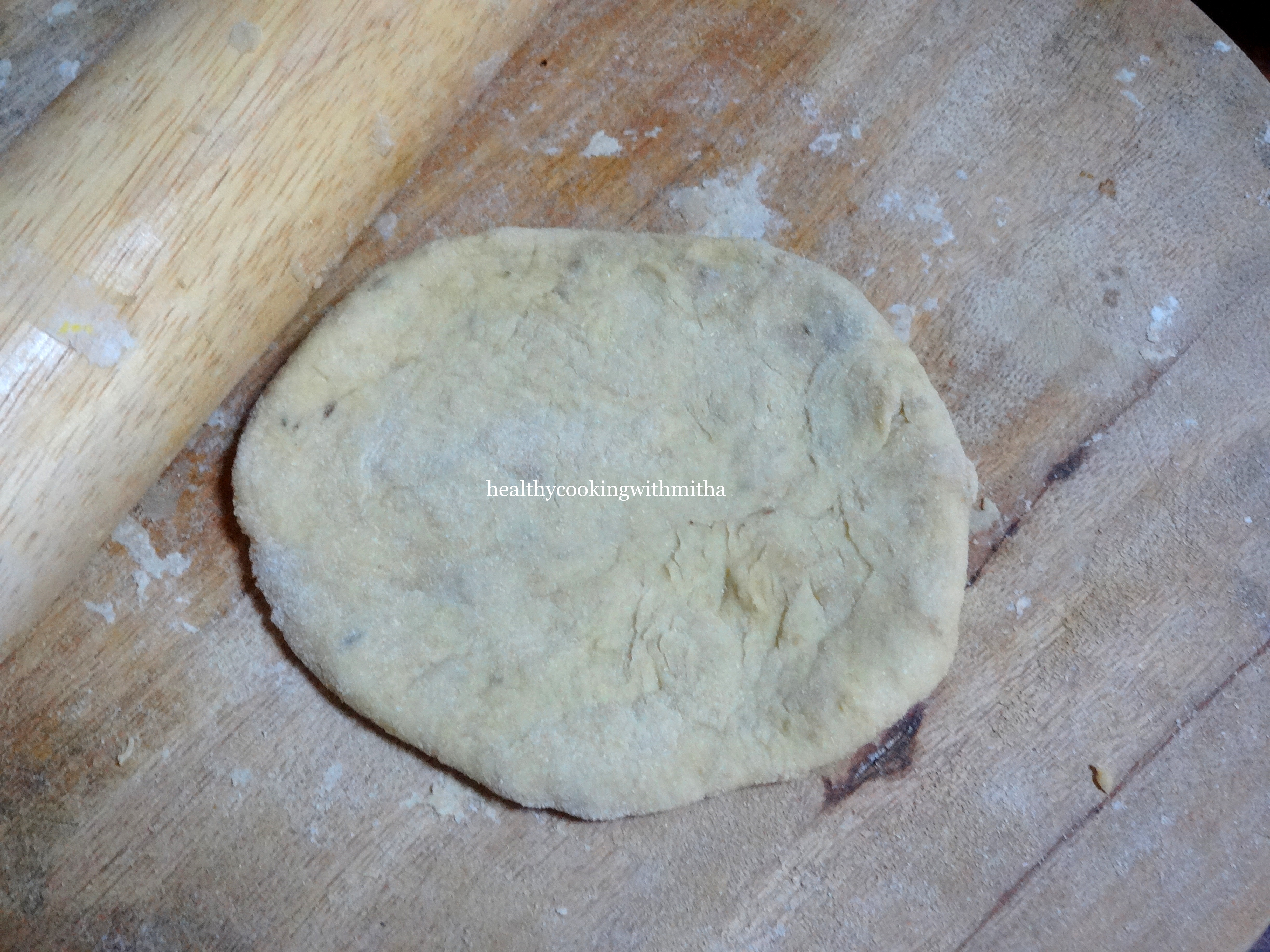 8. Dip again in dry wheat flour and roll as thin as possible, ensuring that you don’t give much pressure as the filling can come outside.