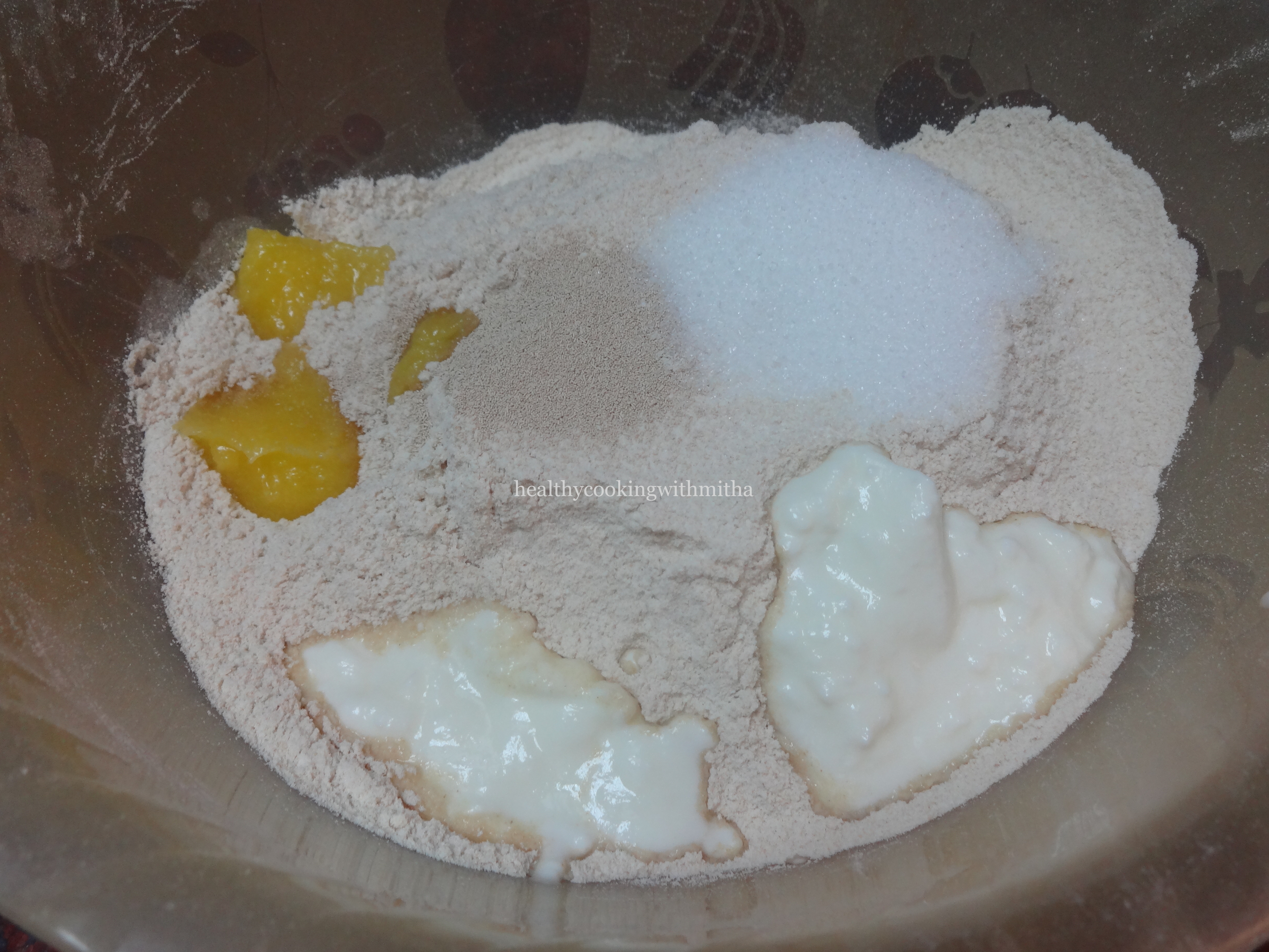 1. Take 3 Cups of wheat flour. Add instant yeast, sugar, salt, yogurt and ghee.