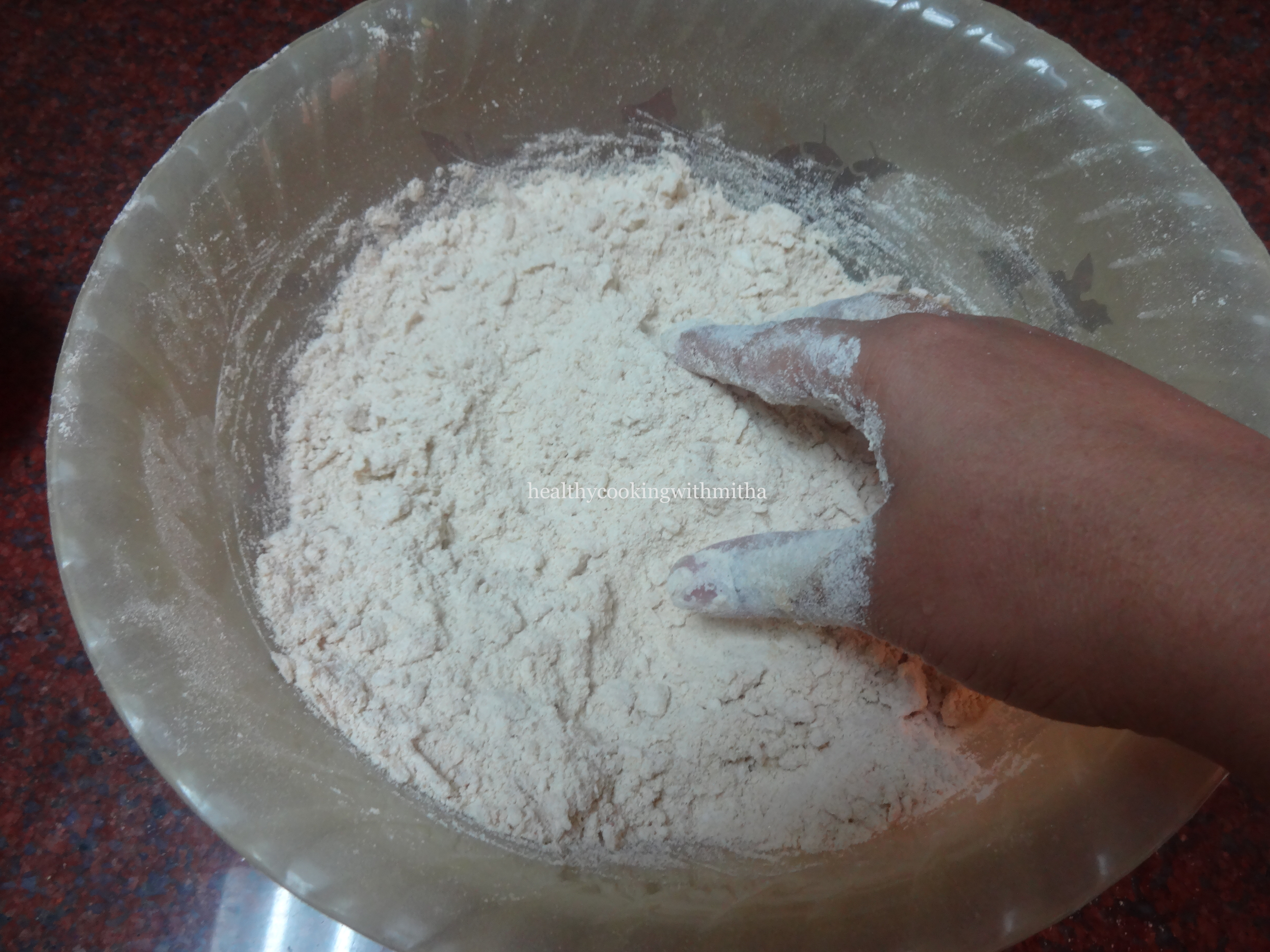 1. Take wheat flour and salt in a bowl and knead using water to a soft but firm dough. The dough should not be sticky.