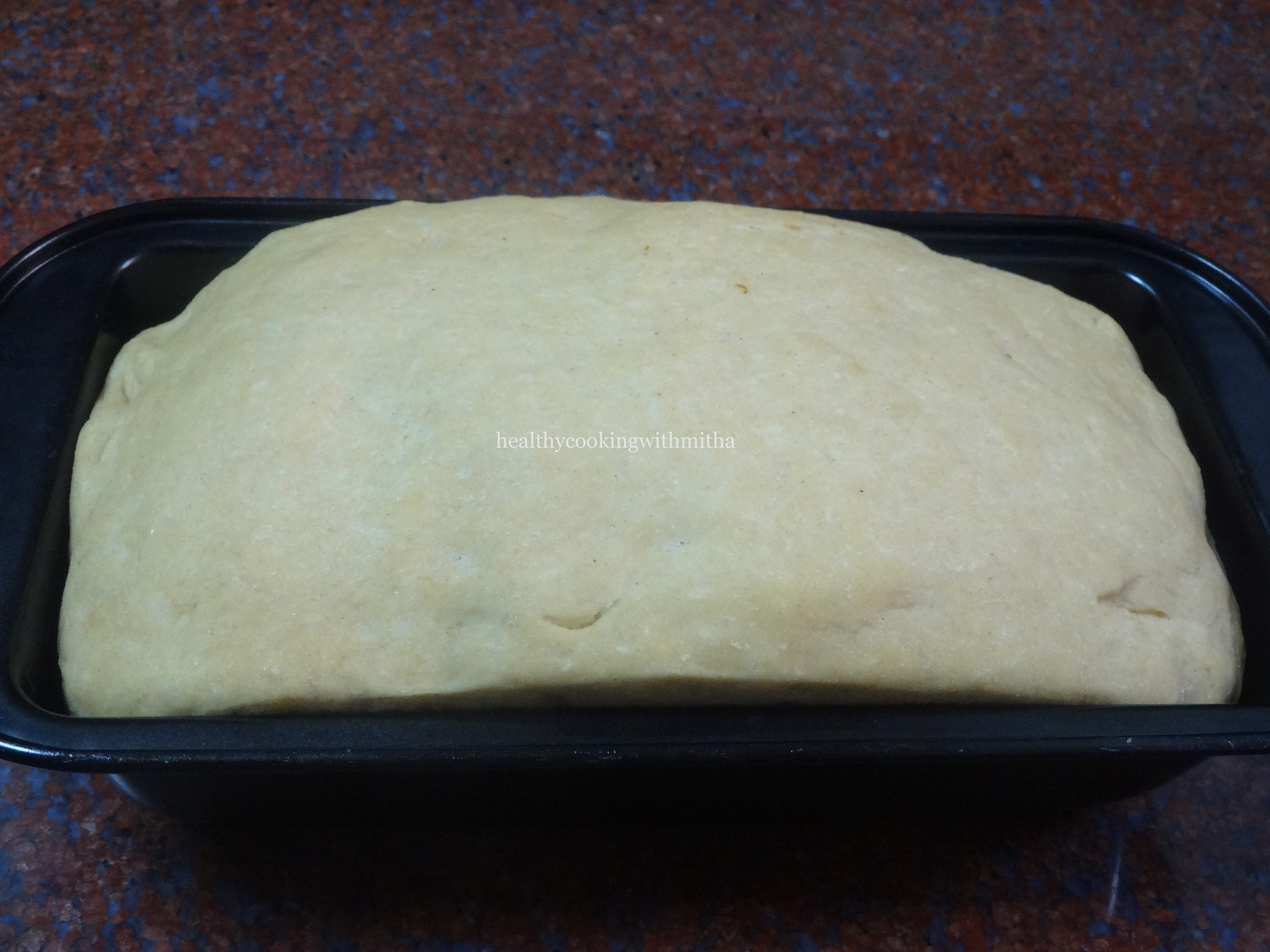 6. Again keep for about 45 mins to one hour till the dough raises above the rim of the loaf pan as shown.