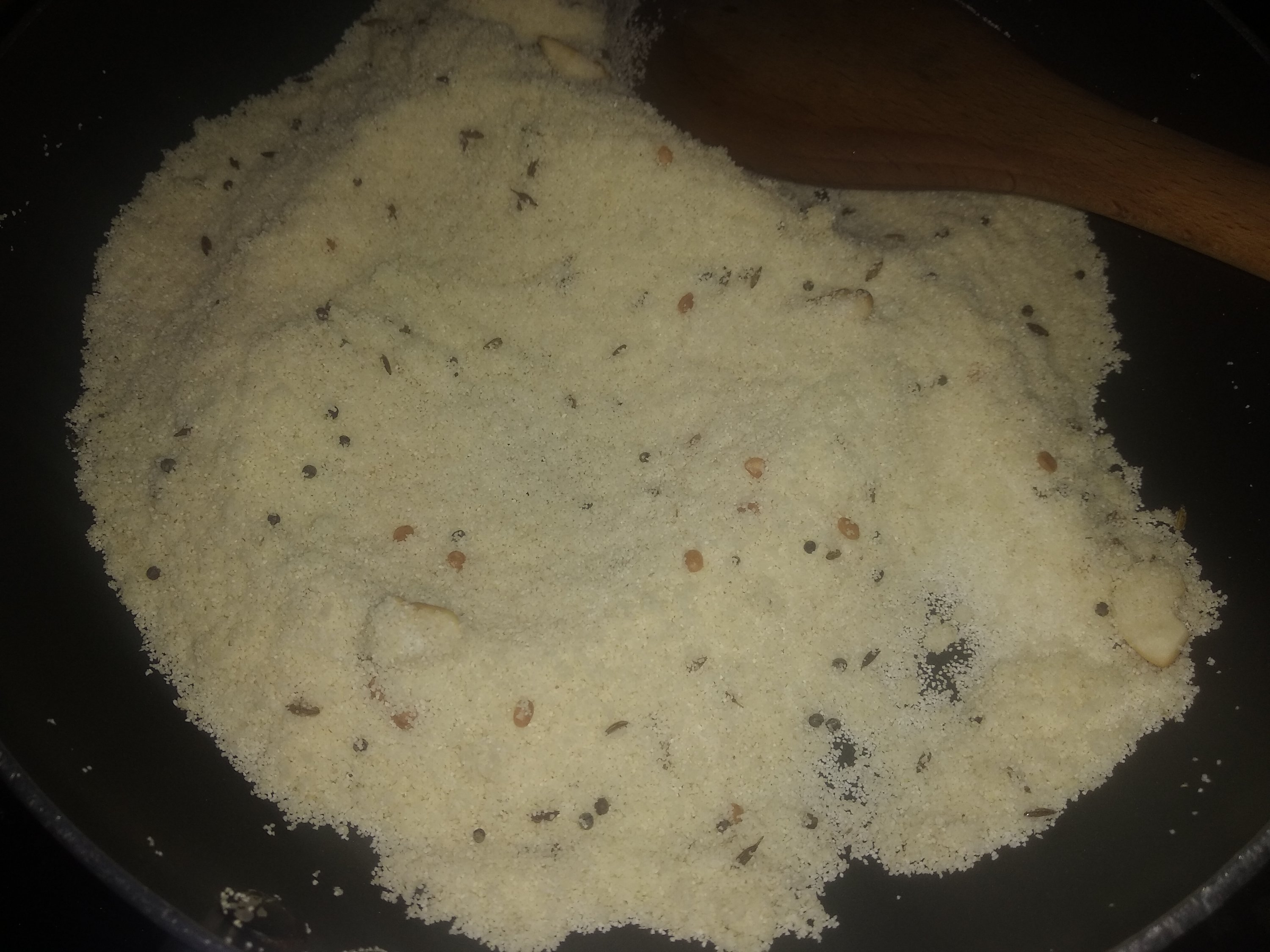 2. Now add rava and fry on medium flame till it changes colour slightly and turns aromatic.