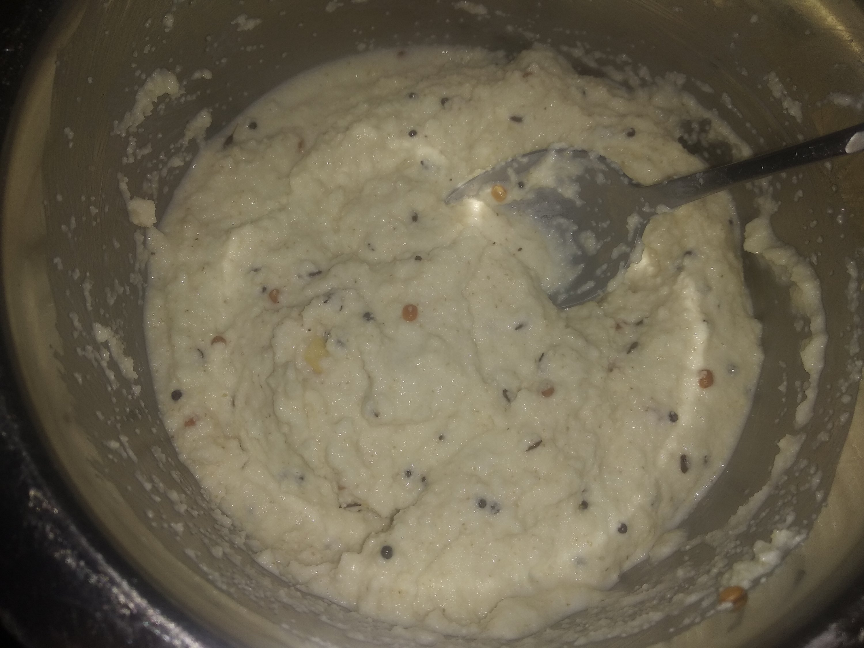 4. Once cooled, add curd, salt and about 1/2 Cup water and mix well.