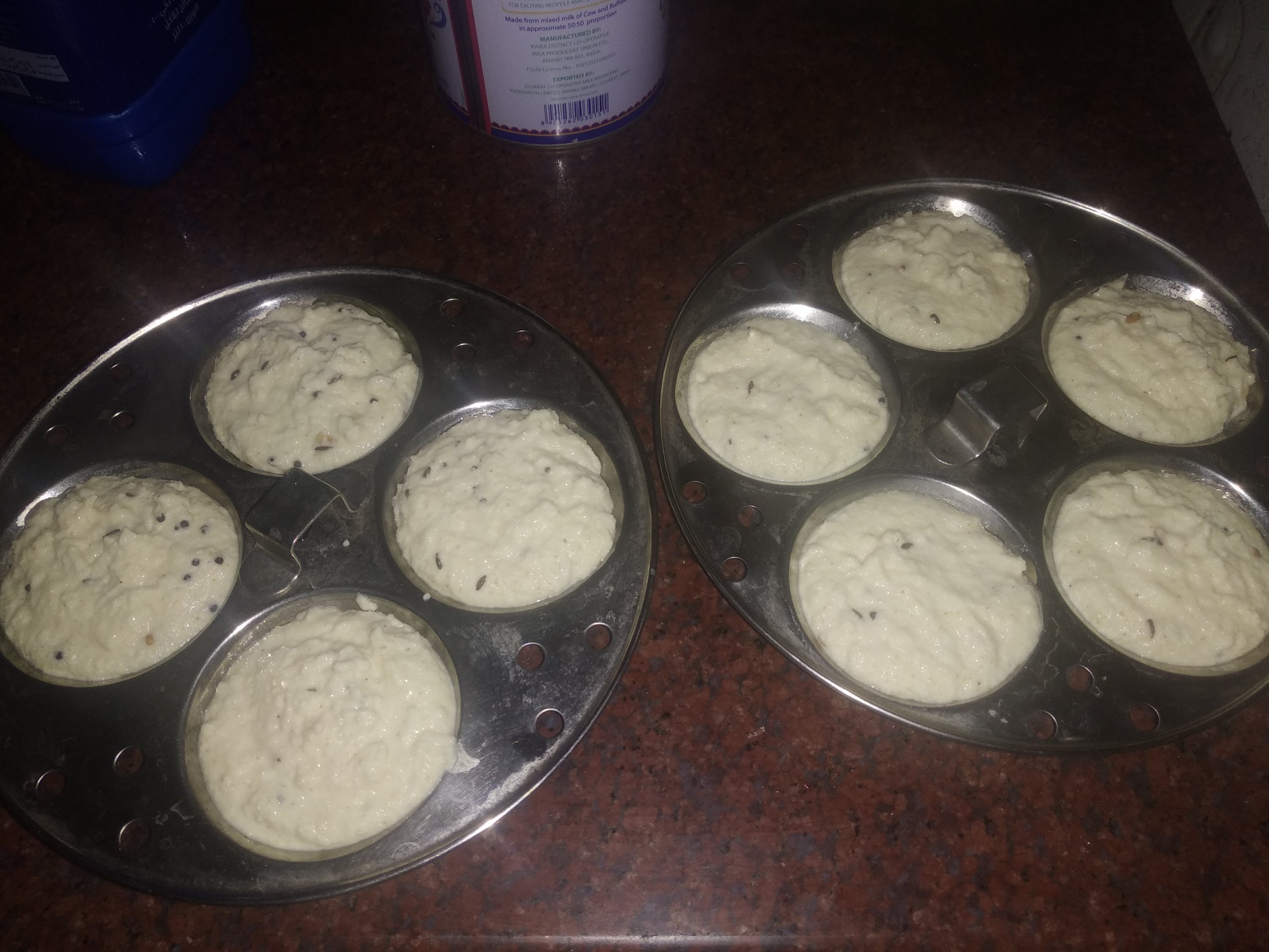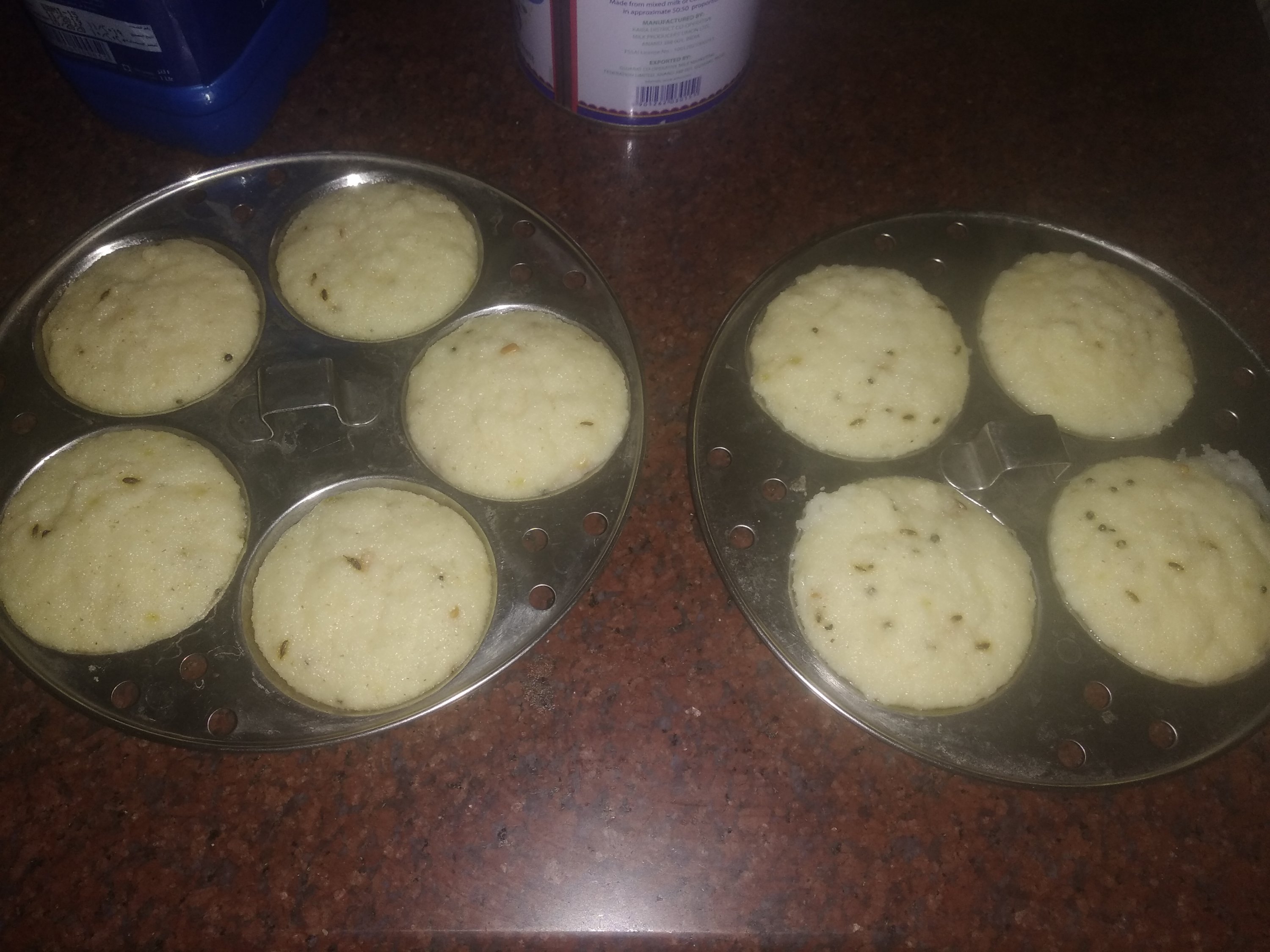 6. Put the batter into greased idli moulds and steam for 20 mins or till done.