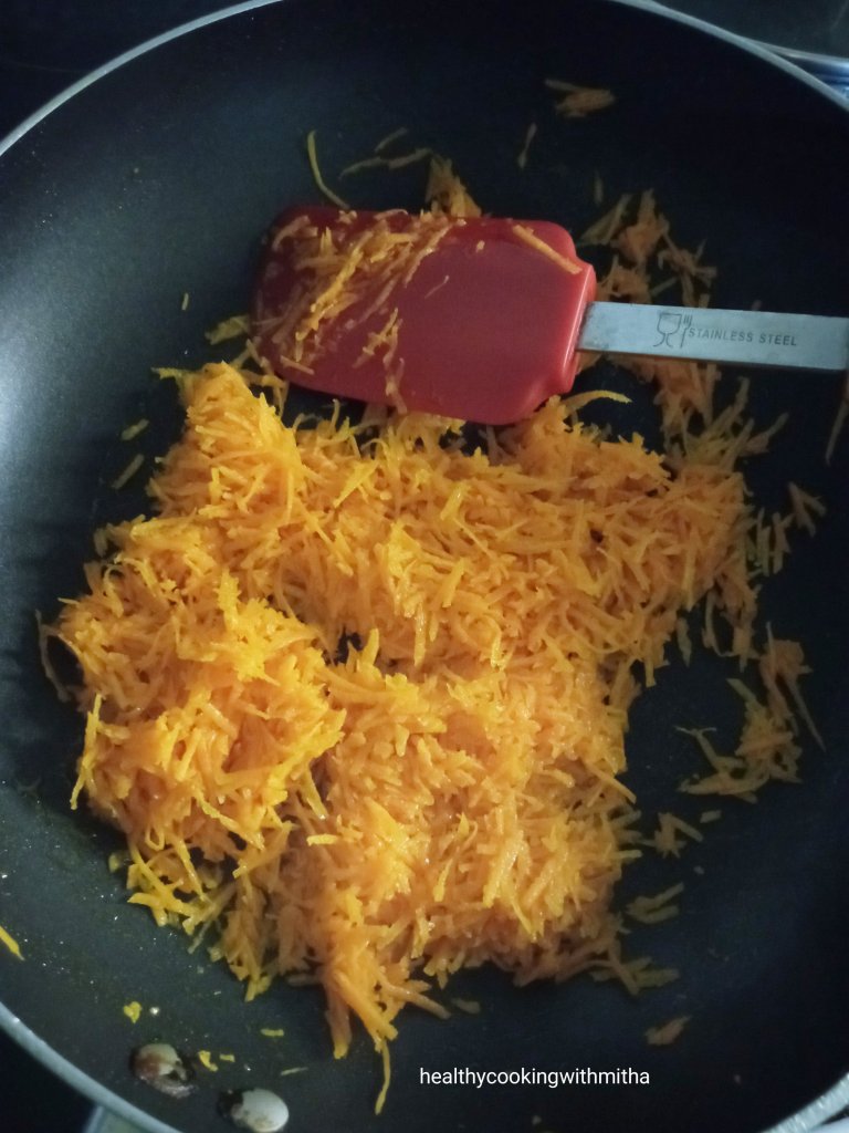 3. Heat ghee in a frying pan and add grated carrots. Fry till the raw smell goes away and the carrots change colour.